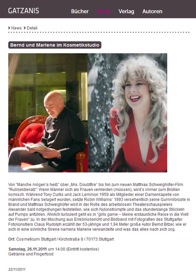 Lesung Bernd Bitzer: girls game: siehe die Pdf Bernd wird Marlene Bernd und Marlene im Kosmetikstudio: Beim Gatzanis-Verlag findet man den Bericht vom 22.11.2011 über die Bücherlesung am 26.11.2011 in Cosmeticum Stuttgart von Bernd und Marlene Bitzer. | ![]() |