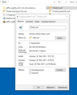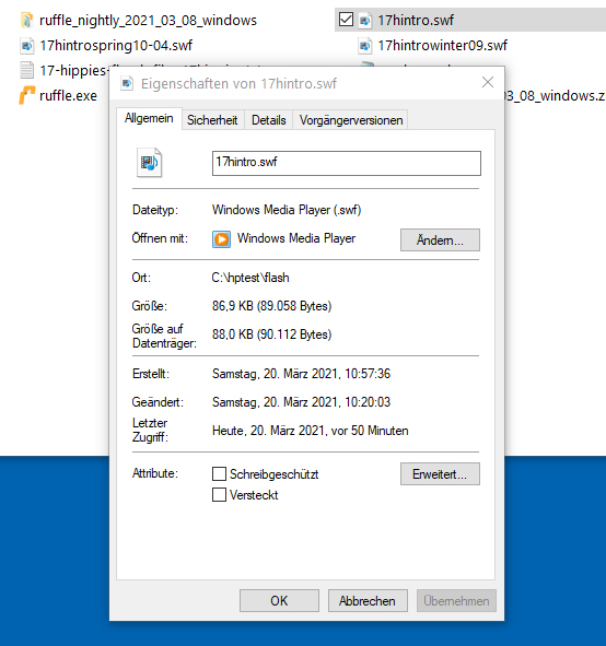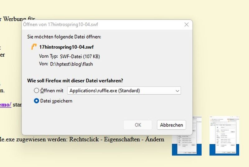Den Flash-Dateien (Flash-Filme *.swf) auf der Festplatte muss nun das Flash-Wiedergabeprogramm ruffle.exe zugewiesen werden: Rechtsklick - Eigenschaften - Ändern - weitere Apps - andere App auf diesem PC suchen - ruffle.exe anklicken |