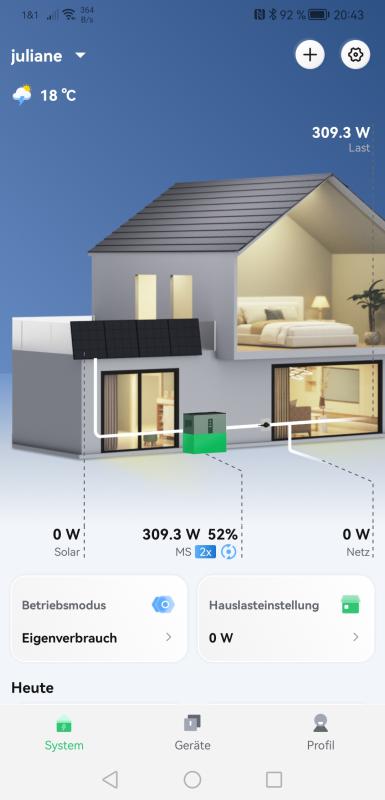 Seit Herbst 2024 habe ich ein neues Hobby: Baute mir selber eine kleine "Balkonanlage" auf einem Minicarport für den Anhänger. Inzwischen ist die Anlage mit 2 Modulen auf dem Garagendach erweitert: Insgesamt 4 Module je 450 Wp, 2 Wechselrichter von Hoymiles, Speicherblock von Hoymiles 2 x MS-A2, 4,48 kW, die Anlage liefert Mittags bei vollem Sonnenschein bis zu 1,5 kW. Der Stromzähler Ecotracker steuert nun alles automatisch. Und nun wird die Null-Einspeisung realisiert. |
