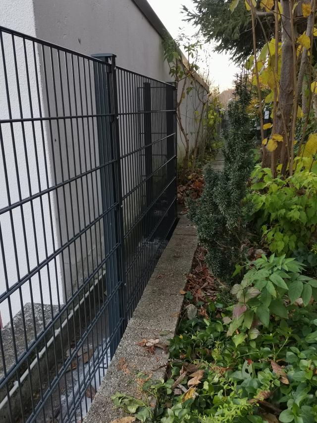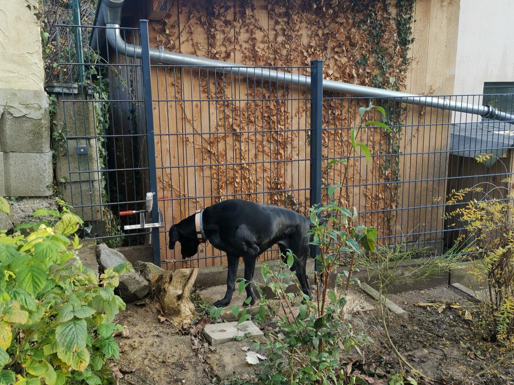 Am 10.11.2025 fotografierte ich den am 3. Tag 05.11.25 neuverlegten Plattenweg am Zaun. Jessy benützt ihn auf ihren Kontrollgängen. |