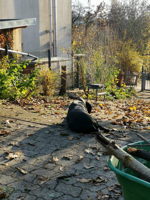 Der alte Drahtzaun zum linken Nachbar Philipp war über 35 Jahre alt und defekt, untere Spanndrähte waren durch Bewuchs gerissen. Jessy nützte dies mehrmals zur Erkundung der Nachbarschaft, bis die damals gebauten stabilen und verzinkten Gitter (schon 23.04.2003 gebaut) dies verhinderten. Die Beetkanten am provisorischen Weg am Zaun standen schief und Jessy lag auf den Laubhaufen in der Sonne. |
