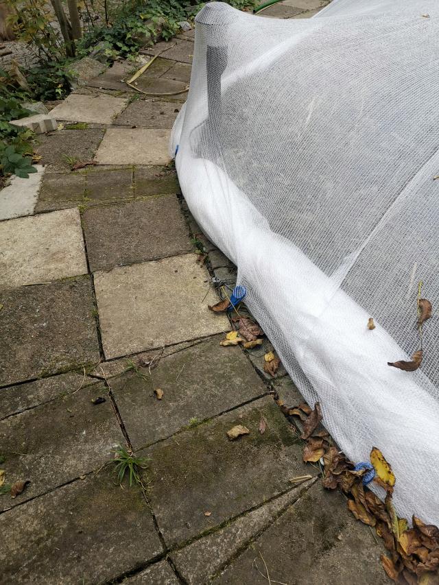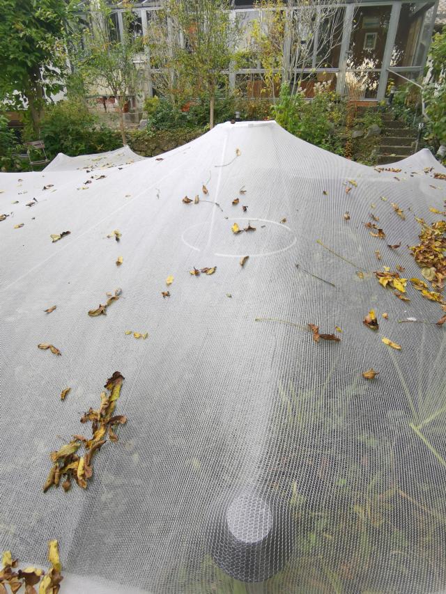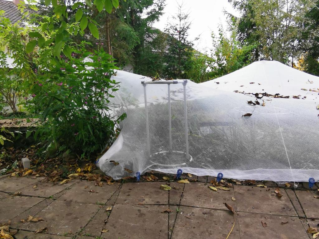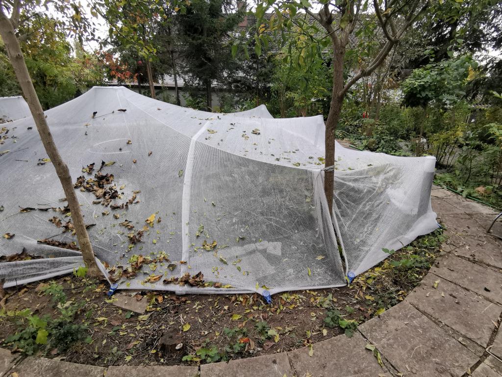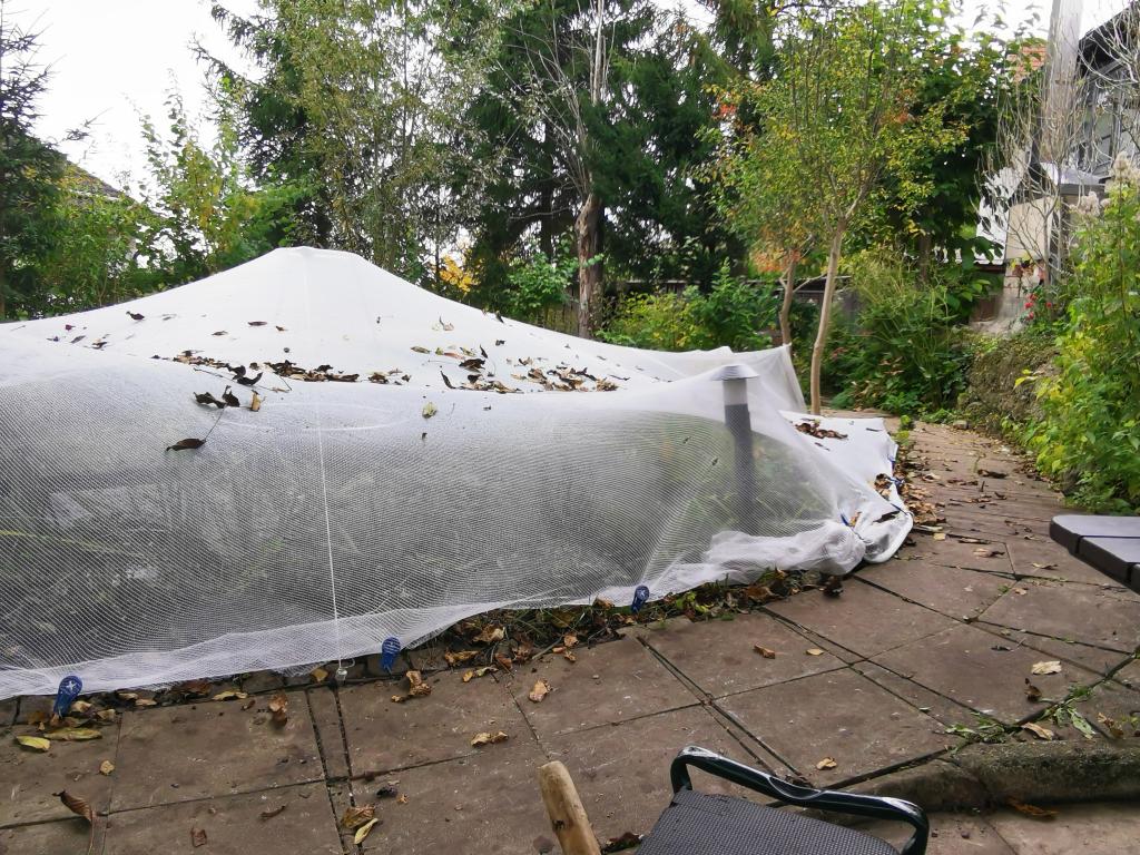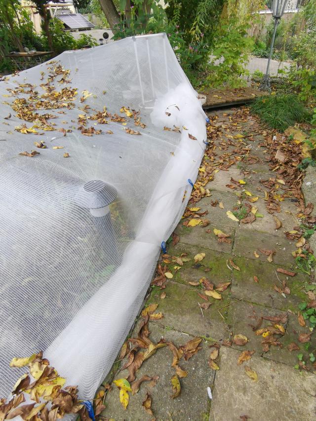 Am 15.10.25 zogen Anne und ich das Netz über den Teich. Nun war doch das Netz mit der niedrigeren Stütze zu groß. |