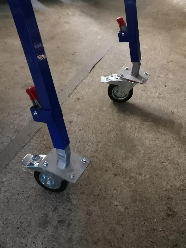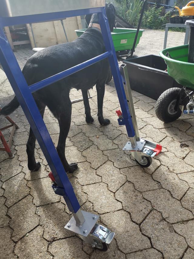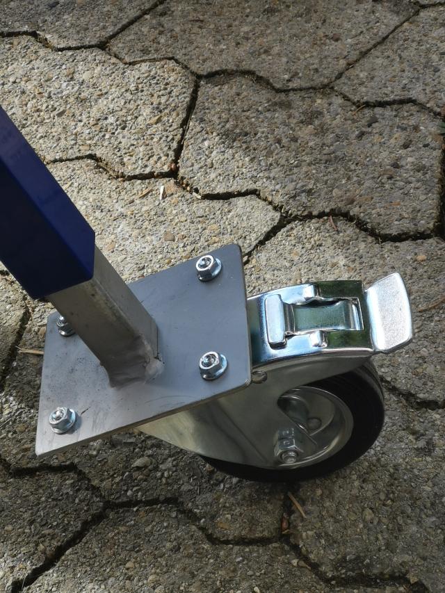 Die Lenkrollen stehen nicht waagrecht und verändern beim Drehen die Höhe, da die Beine schräg stehen. So ist der Schwenkradius sehr eingeschränkt und ich musste einen Knick einbauen, damit die Lenkrolle waagrecht steht. |