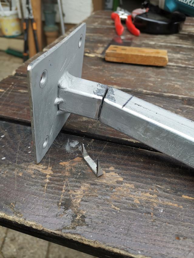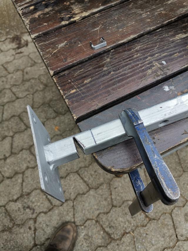 Am einfachsten war es entsprechend dem Winkel einen Keil (auf 3 Seiten) zu flexen und die 4. Seite zu biegen. Damit ist die Anschraubplatte wieder waagrecht und die Bühne läßt sich leicht lenken. |