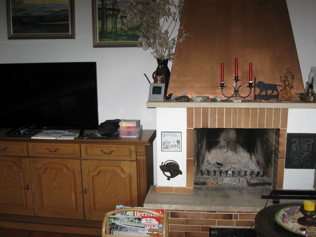 Prototyp Nr 2. mit dem Dach aus normalen Stahlblech stand schon 1994 auf der Terasse, Bild mit Sascha. Bild aus Album 1993-1994. In der kalten Jahreszeit liefert ein großer offener Kamin (Eigenbau, Prototyp Nr.3 aus Edelstahl) mollige Wärme für die Sitzecke, da er in die Glasaußenwand integriert ist. Und am 30.1.2003 ist es dort abends besonders gemütlich. Übrigens ist dieser Terassenkamin vom Kaminkehrer nicht abnahmepflichtig, da der Kamin nicht gemauert ist. |