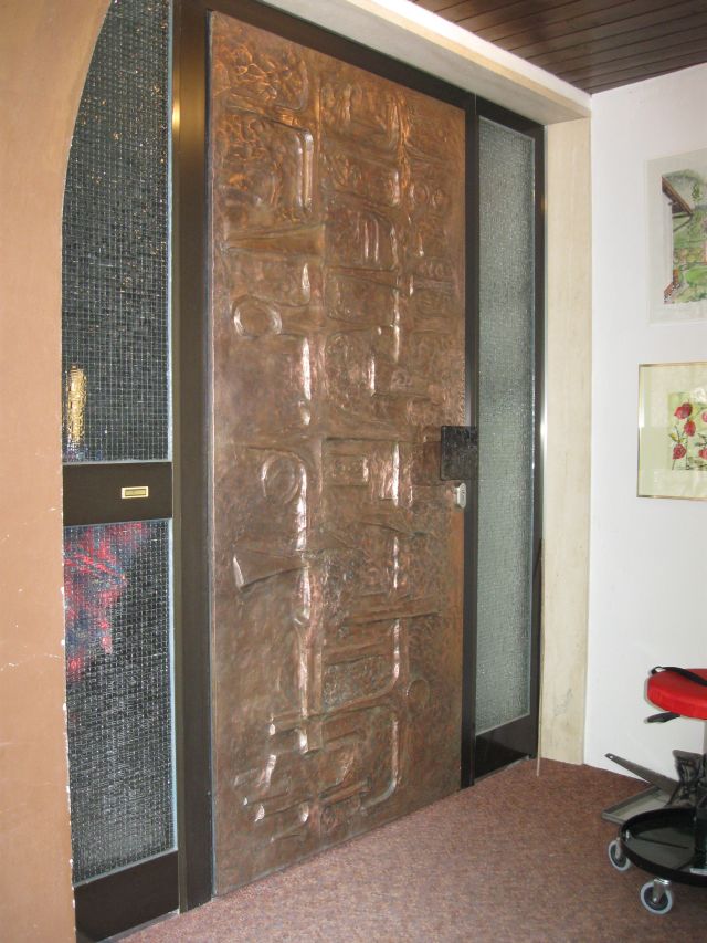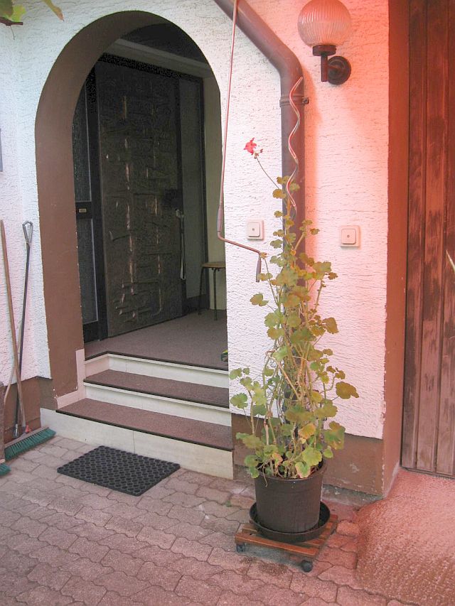 Ostern 1985 kauften meine Frau Barbara (verstorben am 02.12.2016) und ich das Anwesen, der Einzug erfolgte im Januar 1986. Am 13.12.2019 wurde eine neue Haustür von der Fa. Weku eingebaut, die eine bessere Wärmedämmung besitzt. Die beiden Arbeiter hatten kein Problem mit Juliane. Das Gitter rechts neben dem Garagentor und der Schriftzug über dem Briefkasten sind selber gebaut,siehe nächster Abschnitt. |