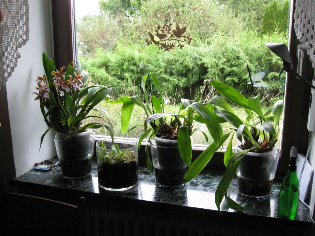 Als Dachglas baute ich 8 mm Verbundglas ein, ansonsten verwendete ich 6 mm Schaufensterglas. Isolierglas dagegen verhindert den Wärmeeintritt der tiefstehenden Sonne im Winter. Bei -10 Grad und Sonnenschein sind im Wintergarten +20 Grad. Ein Frostwächter verhindet Temperaturen unter Null Grad C.. Eine Umluftanlage saugt im Sommer kalte Luft aus dem Kellerbereich und sorgt für angenehme Temperaturen. Im Winter wird warme Luft in den kalten Wintergarten geblasen. Der große Nußbaum und die Hibiskussträucher schatten im Sommer den Wintergarten ab. Am 25.03.1997 war ich dann am vorderen Ende angelangt. |