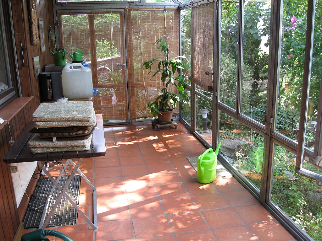 Im Sommer stehen die Pflanzen im Freien, daher ist viel Platz für Bierbänke und Parties, wenn es regnet. Und man kann gut die Nüsse vom Walnussbaum trocknen (Kästen natürlich selber gebaut). |