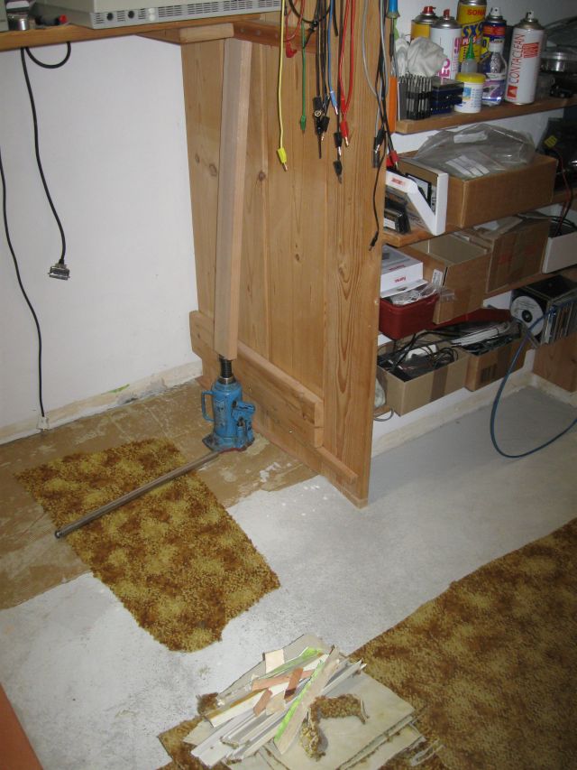 Von der linken Ecke unter den weißen Wandschränken wurde der Teppichboden (er war nicht geklebt), auch unter dem Fenster und bis zur rechten Wand entfernt. Die Regale werden mit den Hydraulikheber angehoben. |