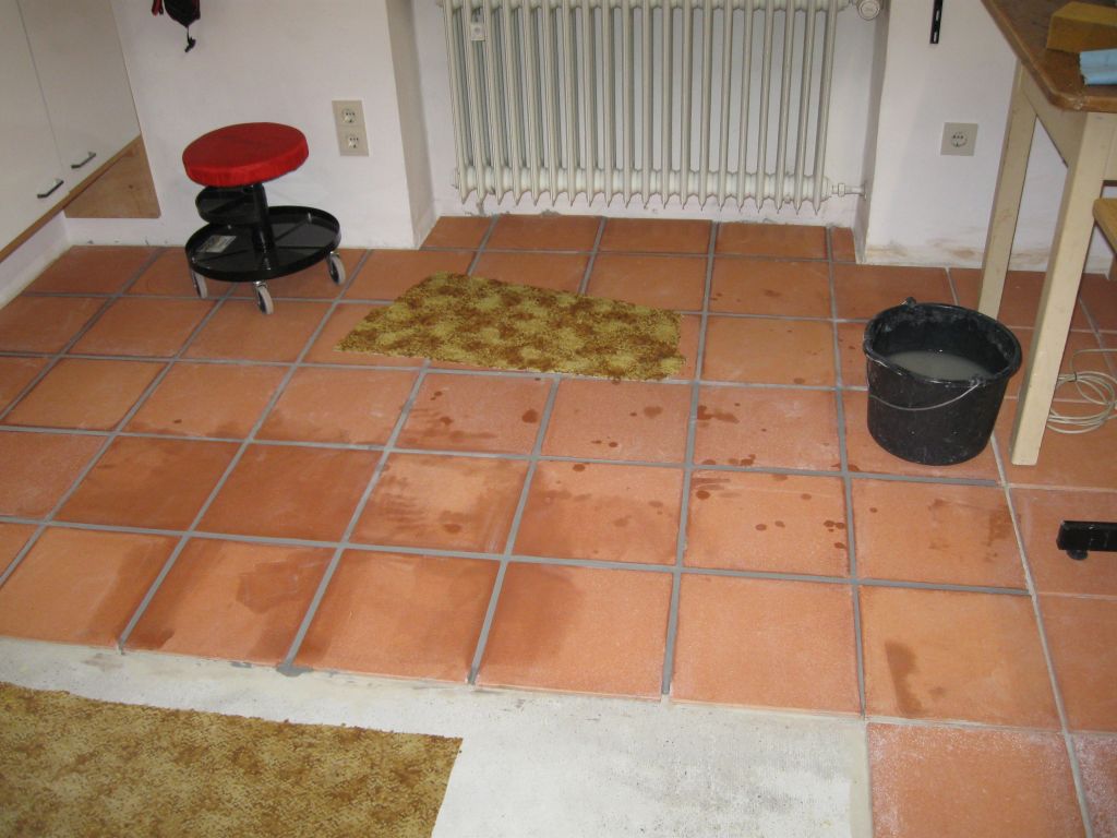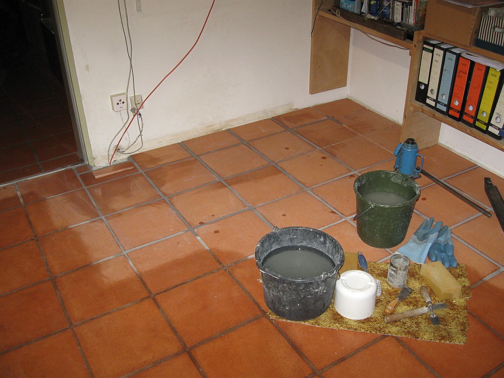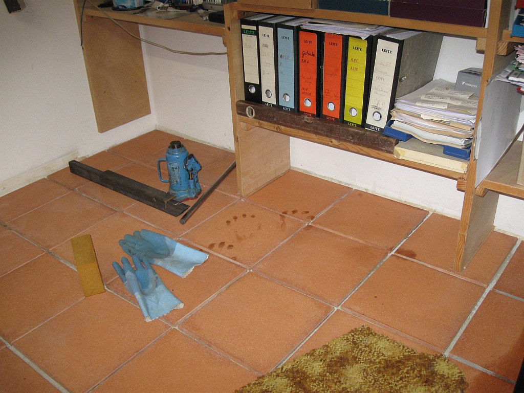Am 02.01.1996 hatte ich begonnen, den alten Teppichboden im Wohnzimmer zu entfernen und mit Terracotta zu belegen. Jahre später war ein Großteil der Haus-Wohnfläche mit TerraCotta-Fliesen anstelle des Teppichbodens gefliest, wie man auch auf den Bildern sieht. Teppichböden und Jagdhunde passen einfach nicht zusammen. Mein Computerzimmerchen hatte noch den uralten Teppichboden. Der musste nun endlich mal rauß. Er war durch den Bürostuhl schon fast durchgerollt. Da aber die Bücherregale nicht abgebaut werden sollten, wurde abschnittsweise gefliest. Daher dauerte es ab Januar 2018 über 4 Wochen, bis ich die 16 m2 gefliest hatte. |