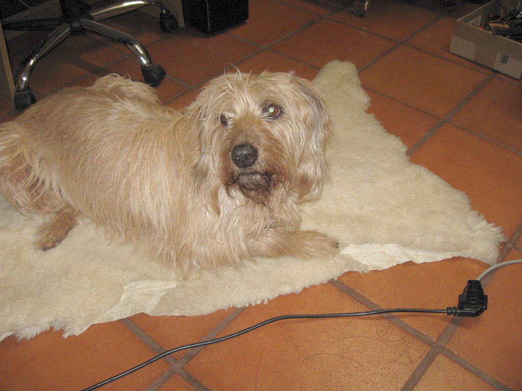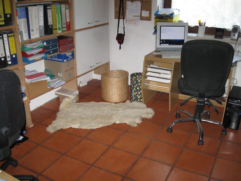 Inzwischen ist fast alles neu eingeräumt und sehr viel ausgemistet. Zwei gleiche Rechner stehen zur Verfügung. Gerda mag das Schafsfell. |