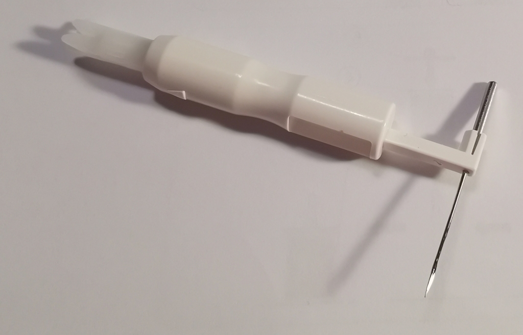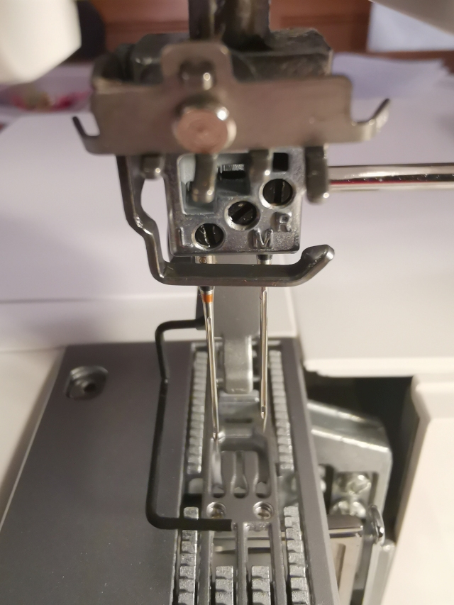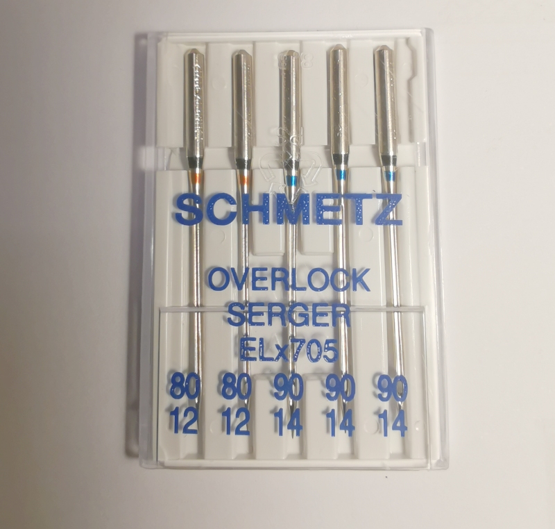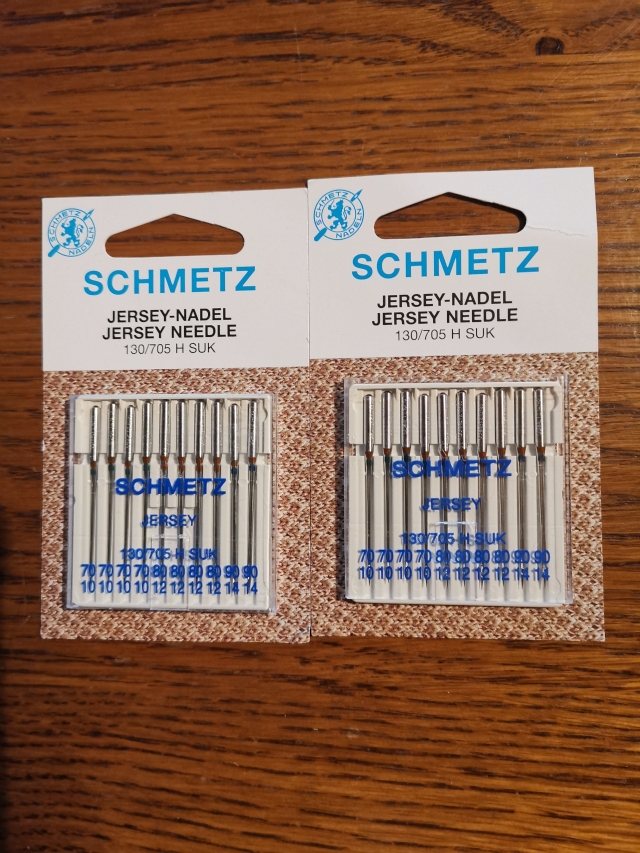 Bei Amazon kaufte ich die Jersey-Nadeln Schmetz 130/705 H SUK (Medium Ballo point), die für Strickstoff besser sein sollen, da die Nadelspitze verrundet ist und nicht den Faden beschädigen kann. |