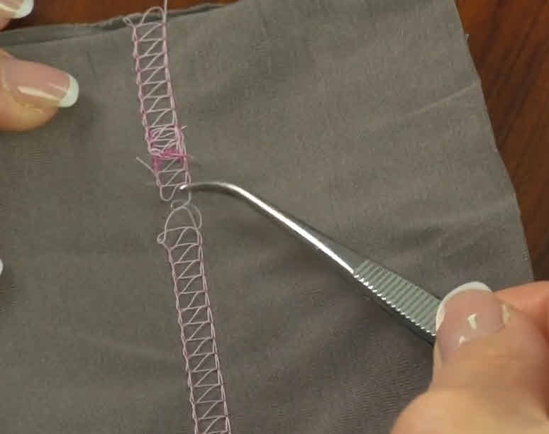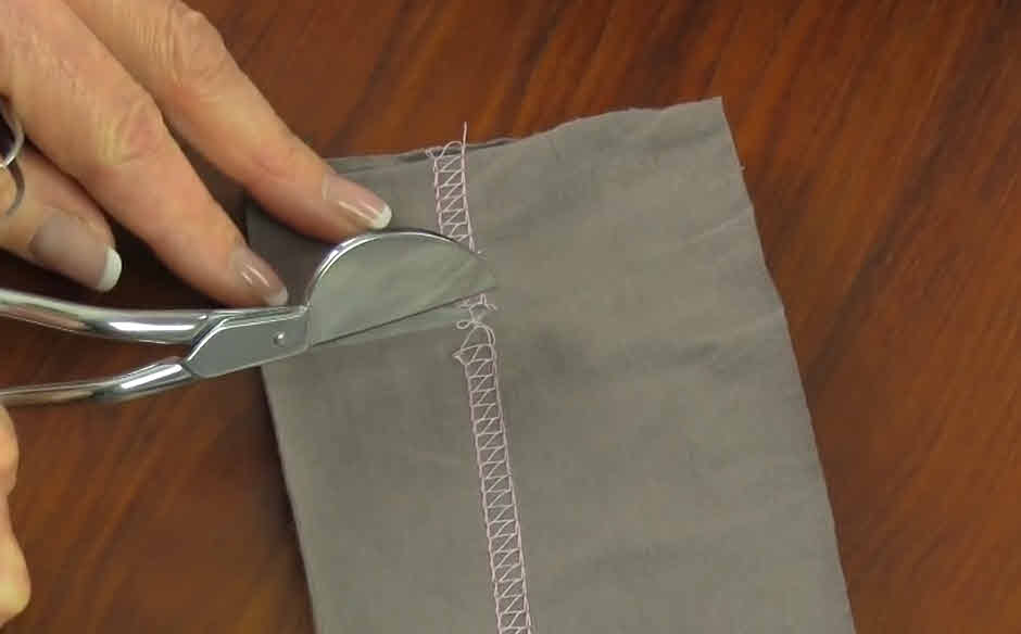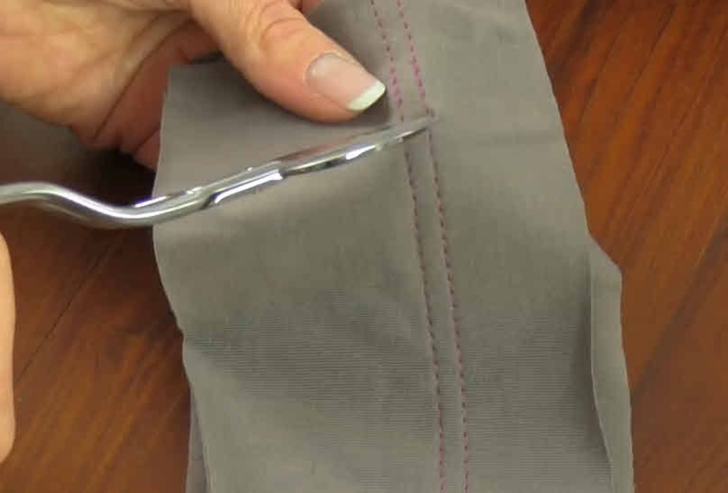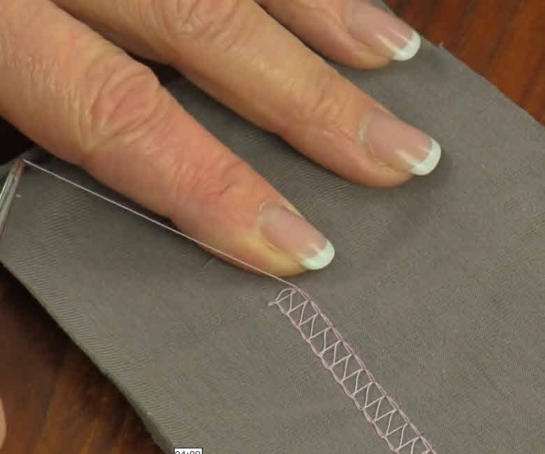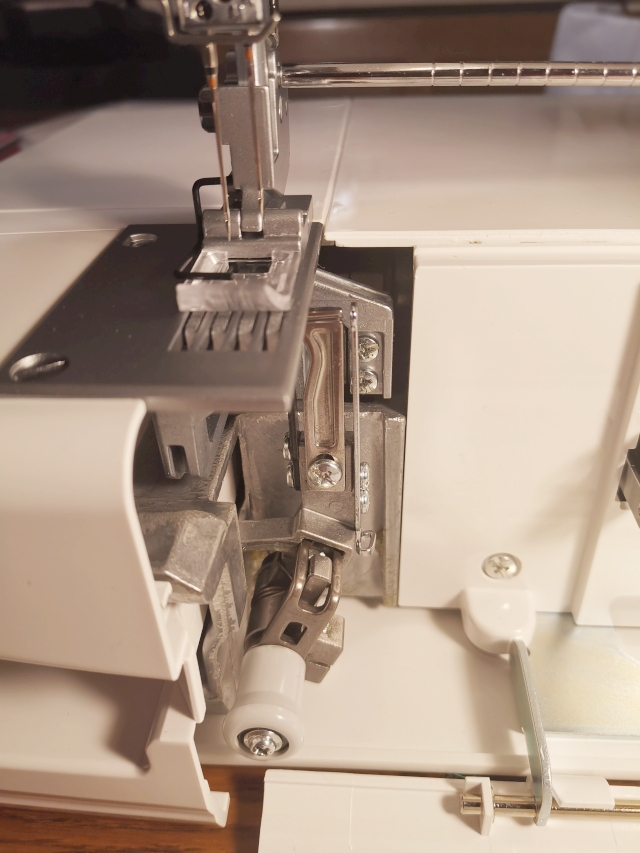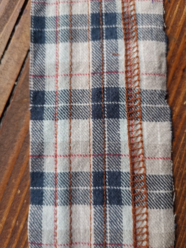 An der rechten Seite der Coverlock stand der vordere kleine Differentialtransportregler auf 0,5 und der Stichlängeneinsteller auf 3,0. Nun erhielt ich eine perfekte Coverlocknaht. |