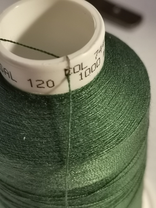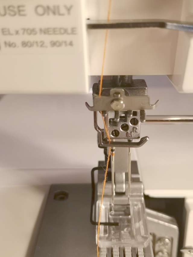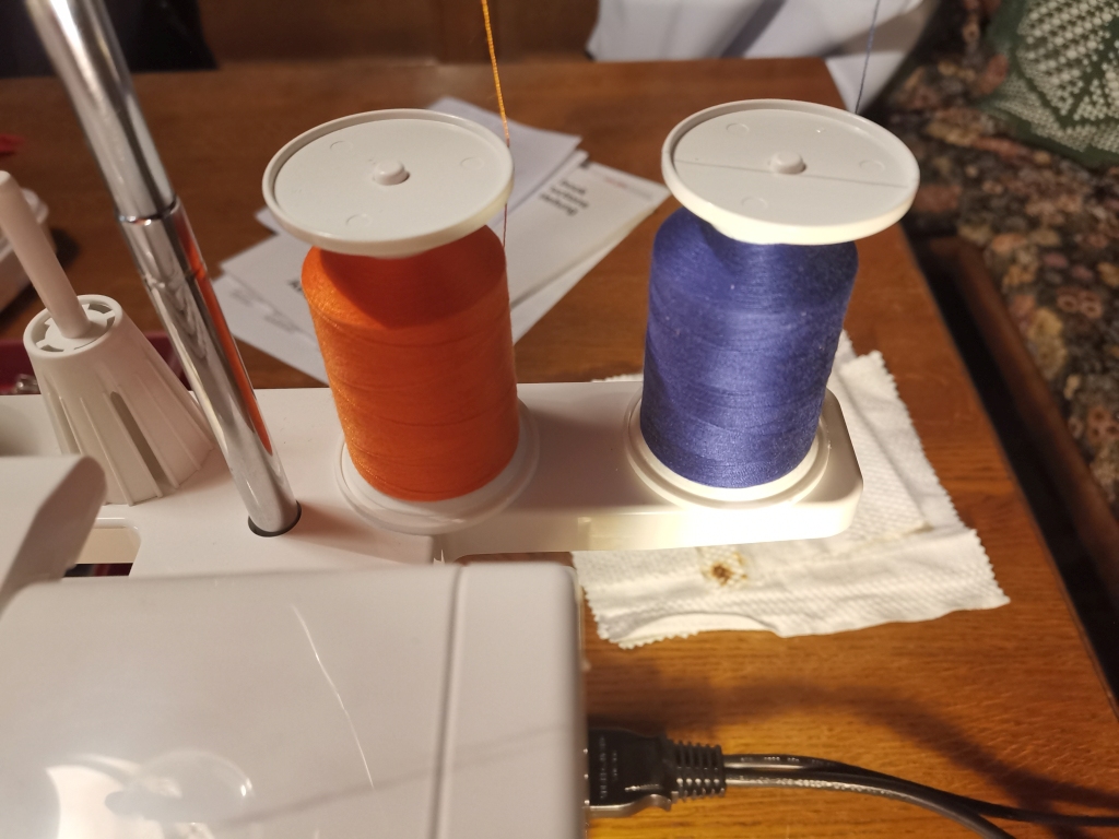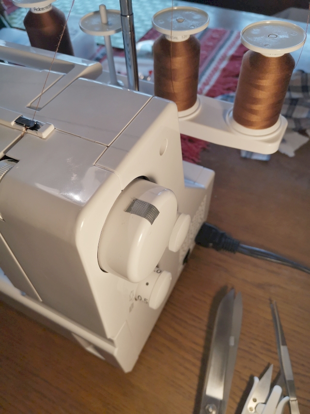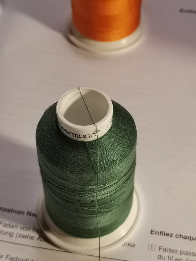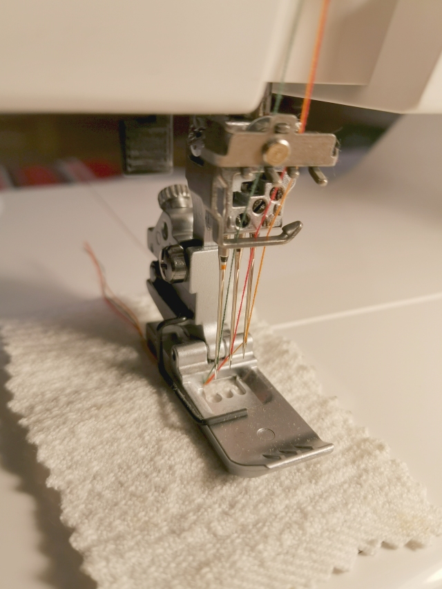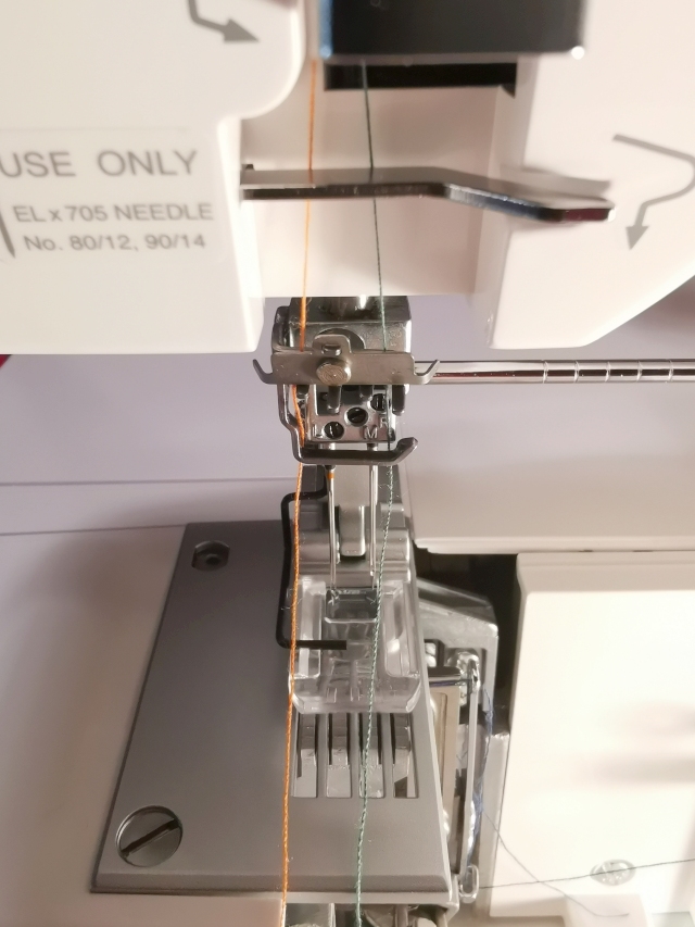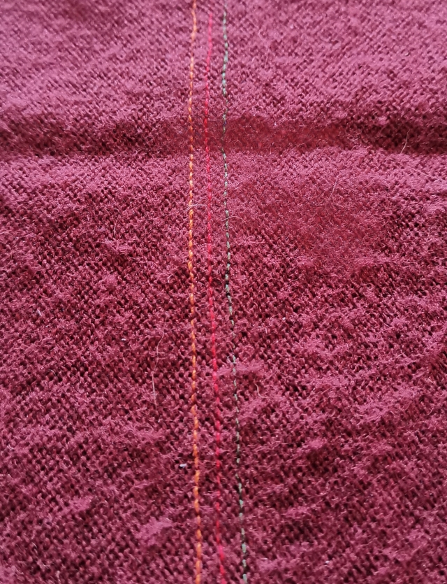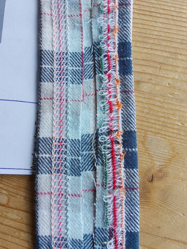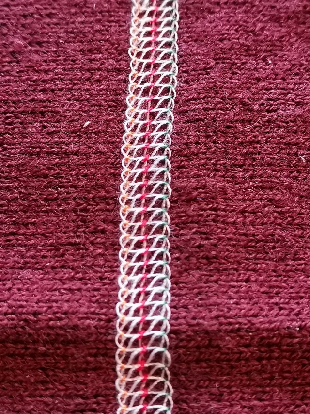 Viele Einstellungsversuche ergaben am Ende ein Nahtbild, das mich erst am Abend, 11.02.22 zufrieden stellte. Ich verwendete das Ackermann-Coverlock-Garn, Stärke 120, Polyester, 1000 m Kone aus der großen Box (linke Nadel grün, mittlere Nadel rot, rechts orange, Unterfaden weiß). |