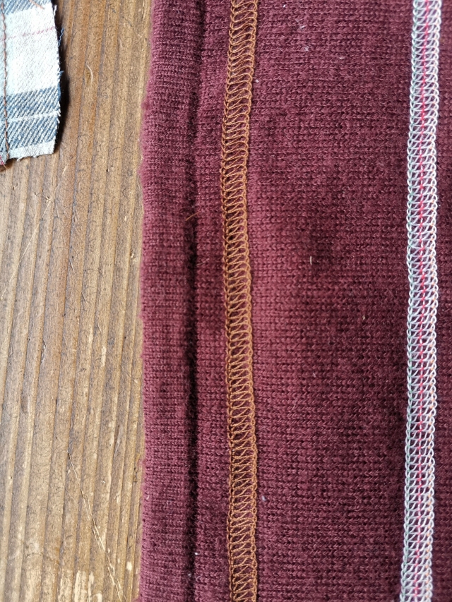 Auch bei dem Stoff meines Jersey-Strickkleidchens (abgeschnittener Ärmelstoff,100% Polyacryl) ist das Nahtbild mit den normalen drei Nadeln einwandfrei: Einstellung: 7,7,7/Soft/3, 05, 3. (brauner Faden Nr. 7622 aus der Ackermann-Box). |