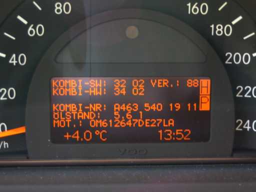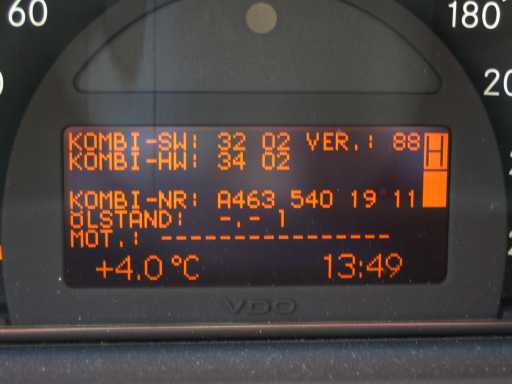 Geländwagen 463: z.B. 463.270 G55AMG Übersicht: GF54.30-P-0997G Werkstattebene: GF54.30-P-2020G Wie bei den Pkws von Mercedes, z.B. E220 (W211) gibt es ab Herbst 2000 bei neueren G's wie z.B. G270CDI oder G400CDI bei der Baureihe 463 weitere Meldungen im Kombiinstrument (über das Display, über Ölstand, Motortyp und ab 2003 die VIN Fahrgestellnummer), die damals nicht im Handbuch und im WIS beschrieben sind. "Bomber" aus Kiev hatte im viermalvier-Forum darauf hingewiesen. Anwählbar sind: Rollentest ESP, Versionsnummern, Voltmeter und bei neueren Display-Versionen die Fahrgestellnummer. Diese vor dem Starten angewählte Funktionen sind dann auch während der Fahrt vorhanden und über die Lenkradtasten anwählbar. Interessant ist auch die Voltmetereinstellung. |