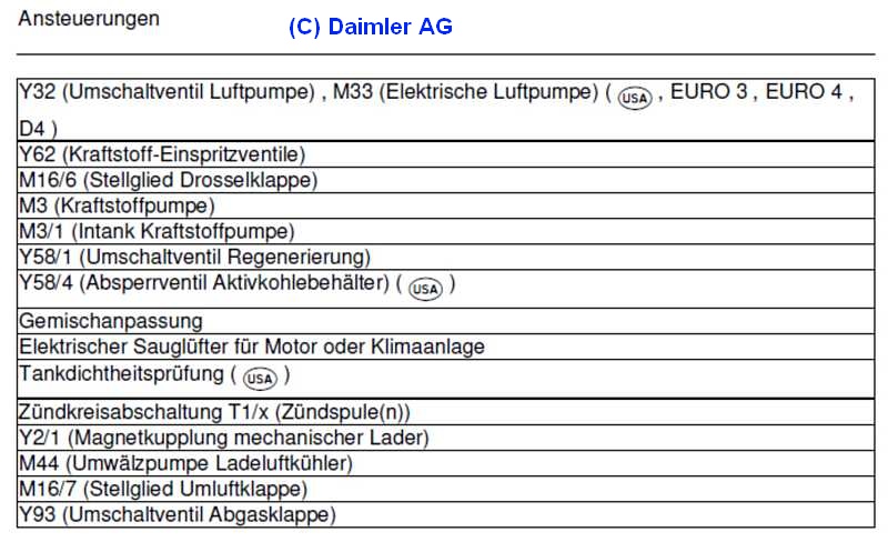 Es gibt verschiedene Schaltplanvarianten zur Pumpe M44: M113.992 bis 28.02.2006 , M113.995 ab 01.03.2006 - 29.02.2008 Motorsteuergerät ME 2.8 N3/10: PE07.61-P-2101-97KF Typ 230: M112.973, M1213.963/99 bis 28.02.2006, M113.995 ab 01.03.2006: Schaltplan Sicherungs- u. Relaisbox hinten SAM: PE54.15-P-2103-97KA Beim SL55AMG wird die Pumpe über das Relais K40/5KR vom Steuergerät N3/10 eingeschaltet. Strom fließt von der Vorsicherung F33 (200A) über die Sicherung f51 (7,5 A) zur KL30 und zu KL87 zur Pumpe M44. Das Steuergerät N3/10 schaltet masseseitig über KL85 das Relais (12V an KL30) ein und legt damit Pin 5 von Motorsteuergerät ME2.8.1 N10/8 an Masse. Im ausgeschalteten Zustand ist Kl30 mit KL87a verbunden. |