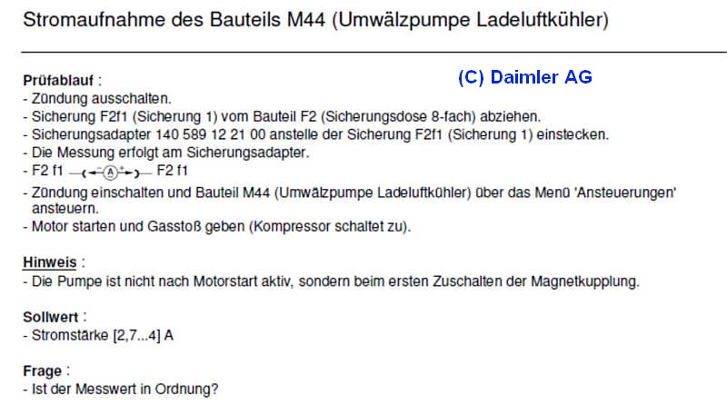G55AMG(K): Bei solchen kurzzeitigen Fehlern sollte man die Stromaufnahme der Pumpe während der Fahrt messen. Am einfachsten geht das an der 10A-Sicherung F21/A am Sicherungskasten Fahrerseite, oberer Reihe rechts, siehe Sicherungen Fahrerseite, Cockpit. Laut Diagnose gibt es einen Strombereich der Pumpe von 2,7 - 4 A. |