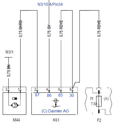 siehe Abschnitt 3.1: Anschlüsse Motorsteuergerät ME 2.8.1 (N3/10): Das Kabel zur Pumpe besitzt eine zweipolige Spezialkupplung A2305400081, MQS, mit blauer Kodierung C (Kabel braun = Masse u. schwarz/rot = Relais K61 von KL. 87 abgesichert, +12 V) M44: Typ 463.270 G55AMG: 10A-Sicherung F21/A, Sicherungskasten Fahrerseite Cockpit, oberer Reihe rechts, siehe hier. Einzelheiten zur Kupplung (Stecker weiblich) siehe Stecker am G . |