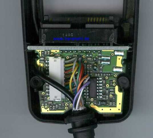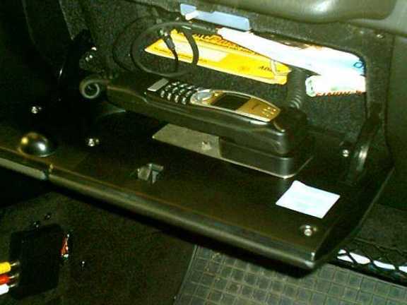 mit einem 10-poligen Telefonstecker. Durch ein Loch im Handschuhkasten kommen das Antennenkabel und die