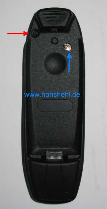Zum Abziehen der Schale wird die Taste (3. Bild, roter Pfeil) gedrückt und die Schale nach hinten abgezogen (blauer Pfeil = Antennenanschluss).