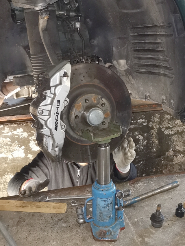 AR33.20-P-0440TX vom 12.11.2009 Unnötige Arbeitsschritte, da der SL auf der Grube steht und der Federlenker ausgebaut wurde: Drehzahlgeber am Achsschenkel ausbauen: Gestänge des Niveausensors am oberen Querlenker abbauen: AR82.10-P-0004R Hinweise: Oberflächen der Aluminiumteile nicht beschädigen. Fahrwerkskomponenten erst im fahrfertigem Zustand festziehen. Arbeitsschritte: wenn das Auto auf einer Grube steht oder 4 Säulenhebebühne - Mittleres und vorderes Teilstück der unteren Motorverkleidung abbauen: AR61.20-P-1105R die drei Muttern oben am Federbein im Motorraum lösen und fast ganz abschrauben. Achsschenkel an der Radnabe oder unter Bremsscheibe abstützen. Federlenker aus Achsschenkel herausdrücken: AR33.15-P-017001R Anzugsmomente: Selbstsichernde Schraube Drehzahlgeber: 25 Nm Selbstsichernde Mutter Federlenker an Achsschenkel: 1.Stufe 50 Nm, 2.Stufe 60 Grad Winkelanzug. benötigte Spezialwerkzeuge: Auspresswerkzeug W220589034300, W129589034300, W140589064300, W220589003300, W163589034300 |