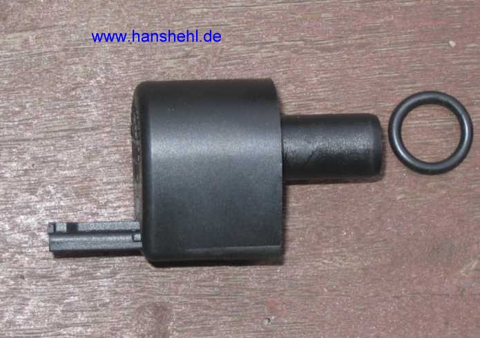 Ein 2 mm starker Dichtring (12 mm Innendurchmesser) verhindert Ölaustritt. Er bleibt manchmal beim Abnehmen der Verschlusskappe im Öleinfüllrohr stecken. Ich schiebe ihn auf den Stutzen der Verschlusskappe, die mit einem kräftigen Ruck auf dem Öleinfüllrohr einrastet. |