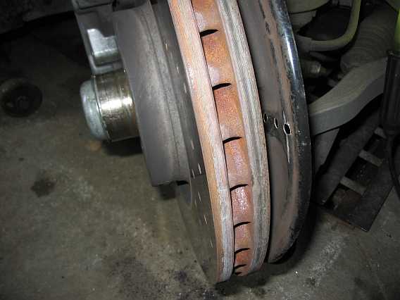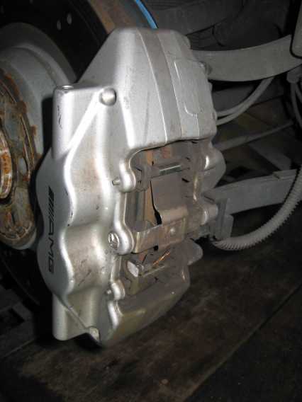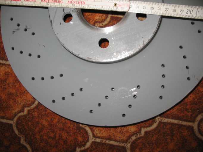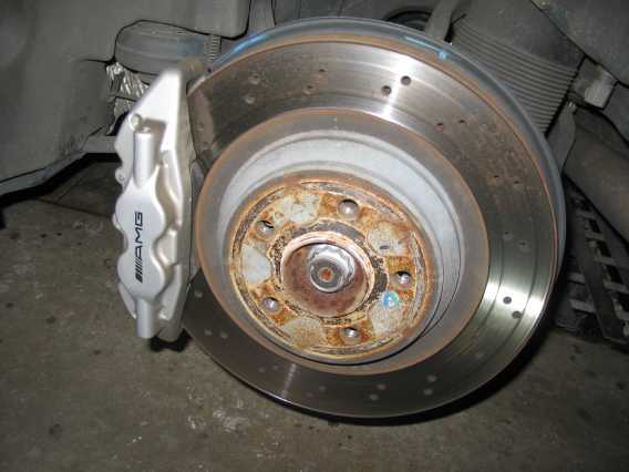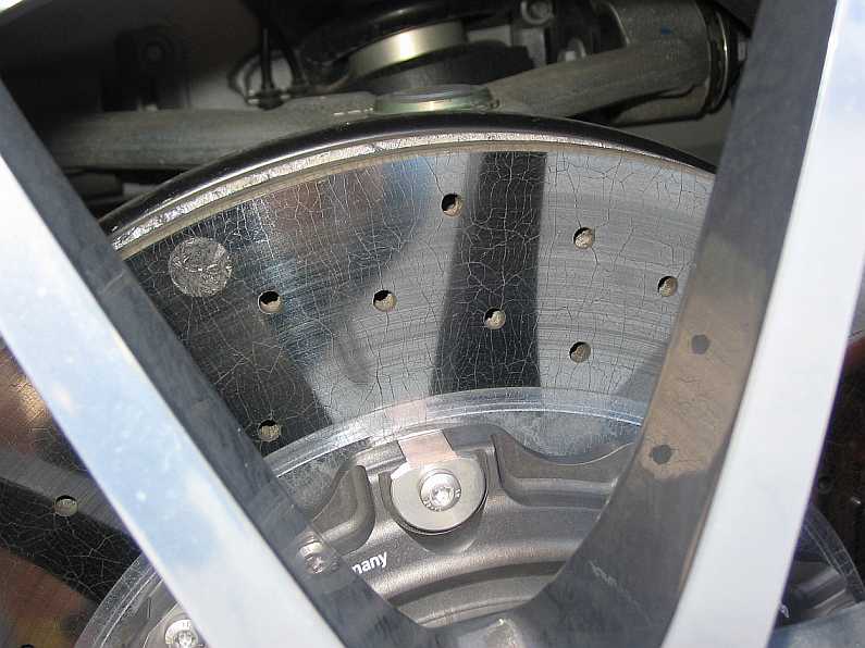 Durch hohe Beanspruchung der Bremsscheibe treten manchmal Haarisse an den Löchern auf. Sie dürfen eine Gesamtlänge von 25 mm (über das Loch gemessen) und eine Gesamttiefe von 5 mm nicht überschreiten. Das Bild zeigt die vordere rechte Bremsscheibe, bei der linken Bremsscheibe waren fast keine Risse zu sehen, warum? Auch ein SLS hatte dieses Problem, wie das 2. Bild von einem AMG-Treffen zeigte. |