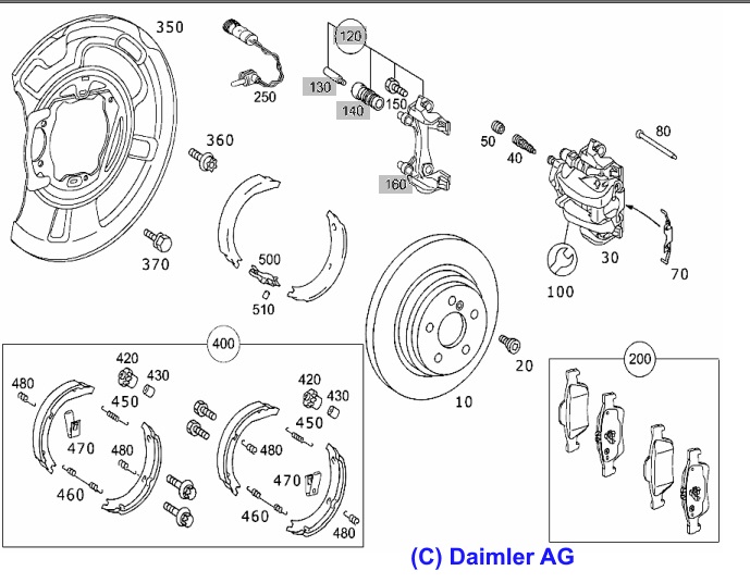 Teilesatz: A2304200320 Bremsbacken aus-, einbauen: AR42.20-P-0530I Wichtig ist das Einbauwerkzeug (W112589096100) für die Andrückfedern der Bremsbacken der Feststellbremse (wie beim 300SE oder G55AMG). Praktisch ist auch der Zughaken (W116589016200) zum Aushängen der Rückzugfedern. |