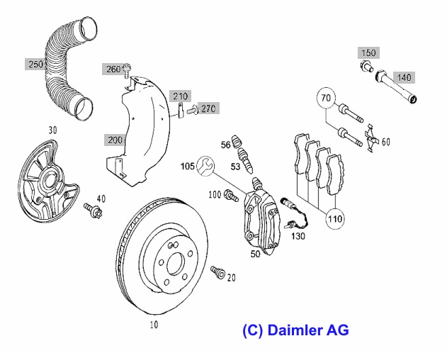 Hinweise zum Kontaktfühler-Einbau: AH42.10-P-0003-01A Der Belagfühler A2115401717 ist beim 230 für Vorder- und Hinterachse gleich und immer am äußeren Bremsklotz. Vorderachse: Typ 230 bis 08/2002: je Rad/Bremssattel ein Fühler Typ 230 ab 09/2002: rechtes Rad/Bremssattel: ein Fühler Hinterachse: nur 1 Fühler am rechten Rad/Bremssattel Das von den Stiften am Bremssattel gehaltene Federblech (Haltefeder: A0004218791) drückt auf die Bremsklötze. Bremsklotz Teilesatz: A0034206220 Die Haltestifte (TS-Bolzen: A0004202882) sind übrigens aus Edelstahl V2A, nur der Klemmring kann noch rosten. |