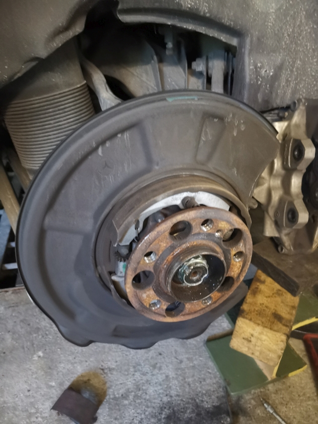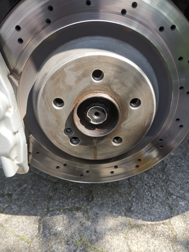 Wird nicht mit der Diagnose die SBC-Bremsanlage deaktiviert, muss man folgendes beachten (Vorsicht, nicht für Anfänger, auf eigene Gefahr!) Auto vorher auf die Grube gefahren, dann Zündschlüssel abgezogen, keyless-Go-Karten sind im Haus, das Fahrer-Seitenfenster unten, beide Türen und Heckdeckel zu, aber nicht verriegelt. Feststellbremse gelöst, Wählhebel auf "P". Die Motorhaube sollte aufgestellt sein, damit man beim vorsichtigen Zurückdrücken der Bremskolben den Flüssigkeitsstand im Bremsflüssigkeitsbehälter kontrollieren kann, damit er nicht überläuft. Auf der linken Seite war die Bremsscheibe noch fester, mit einem Knall löste sie sich mit dem Abzieher, der sein Geld wert ist. |