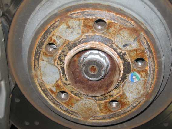 Es gibt anscheinend keinen Bremsscheiben-Abzieher im Werkzeugprogramm von Mercedes. Im Zubehörhandel findet man bei Hazet oder Nexus zweiarmige Abzieher für die große Bremsscheibe mit 36 cm Durchmesser, gefielen mir nicht. Im Juni 2021 kaufte ich bei Amazon den sehr kräftigen BGS Bremsscheibenabzieher, Nr. bis 400 mm, da die Bremsscheibe hinten links schon festgerostet war. Allerdings muss man bei der Vorderachse die Radkappe abziehen, da sich die Spindel des Abziehers auf dem Achsstummel abstützen muss. Man sollte vorher den Rost im Passsitz der Bremsscheibe auf der Radnabe mit Rostlöser behandeln. |