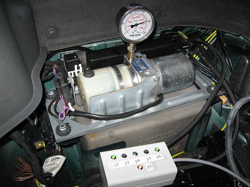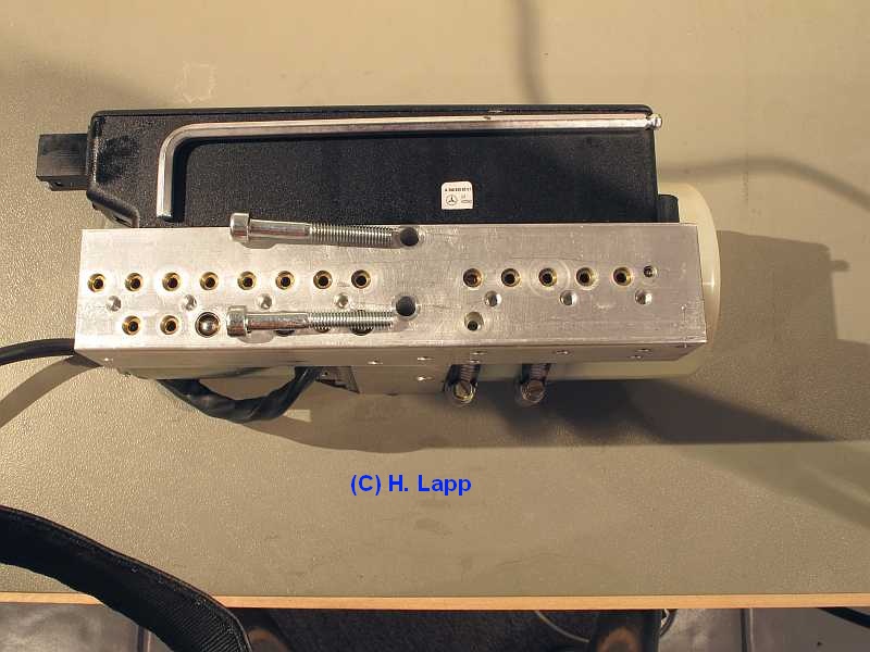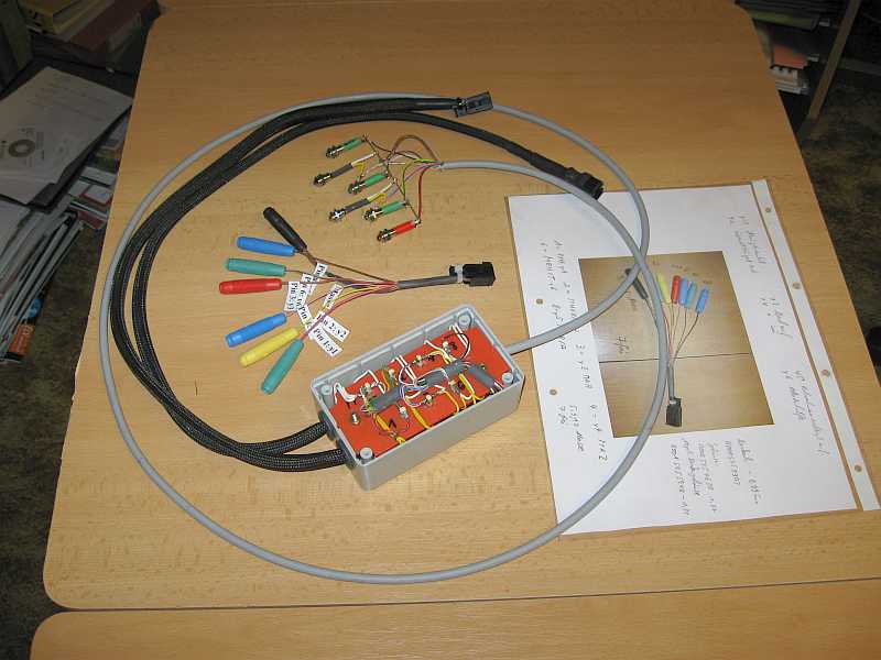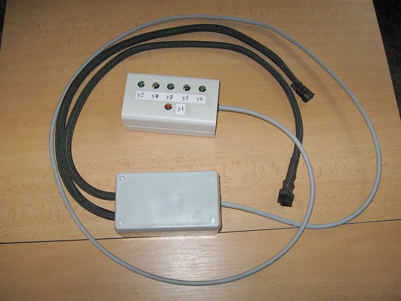 Um diese Schaltreihenfolge der Magnetventile anzuzeigen, entwickelte ich einen Y-Adapter mit Leuchtdiodenanzeige. Der Adapter hat ein 10-poliges Kabel, dessen Stecker (Kupplung) anstelle des originalen Kabels in den seitlichen 10-poligen Steckanschluss am Ventilgehäuse der Pumpe gesteckt wird. Das zweite Kabel hat einen Stecker, der an das von der Pumpe abgezogene Kabel kommt. Das dritte Kabel mit der Leuchtdiodenanzeige wird außerhalb des Kofferraums geführt, sonst sieht man ja nur wenig, wenn sich das Dach und der Kofferraum schließen ;) . |
