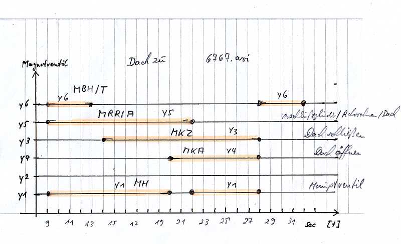 Im Testlauf ist der Überrollbügel schon abgelegt. 8 sec nach dem Start der Digitaluhr wurde der Dachschalter betätigt, da beginnt das Schalt-Ablaufdiagramm der Magnetventile (Bild 2). In den Filmen ist auf dem Adapter die Bezeichnung y3 durch y4 zu ersetzen, bzw. y4 durch y3. Dach schließen: MVI_6767.AVI |