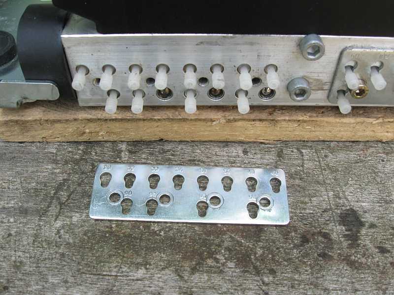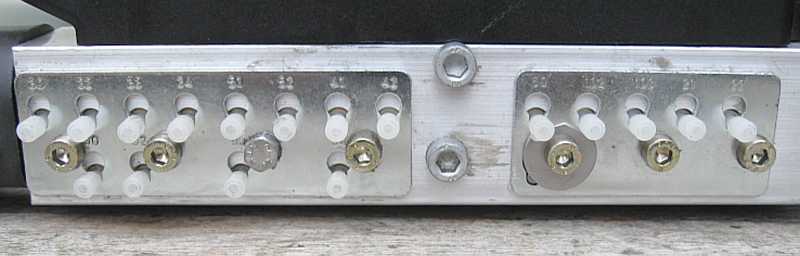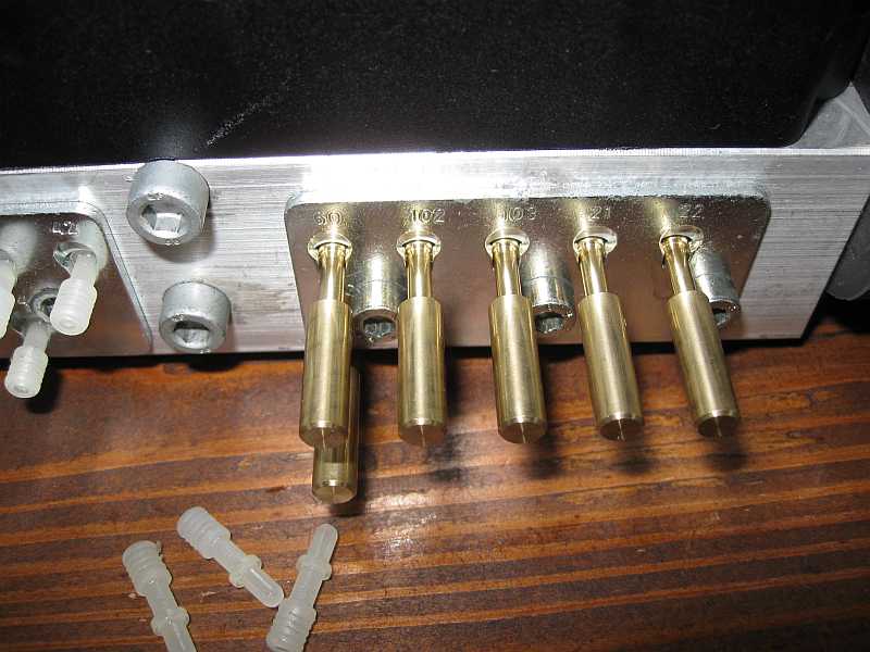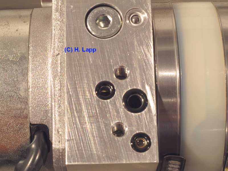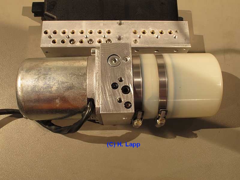 Sieben Schrauben M5 x 8 (2,5 Nm) halten die beiden Verschlussbleche. Verschlussstopfen aus Kunststoff (nicht druckfest) verhindern das Eindringen von Schmutz. siehe Hydraulikeinheit aus-, einbauen: AR77.37-P-3500R) und sl55amg-uerb1.htm#b3 Die Leitung Nr. 100 ist für Drucktestmessungen mit einem 3,2 mm Metallstöpsel verschlossen, der von einer Beilagscheibe gehalten wird. So kann man die Pumpe auf dem Labortisch laufen lassen, wenn die Magnetventile dicht sind. Besser sind die Messingstopfen. |
