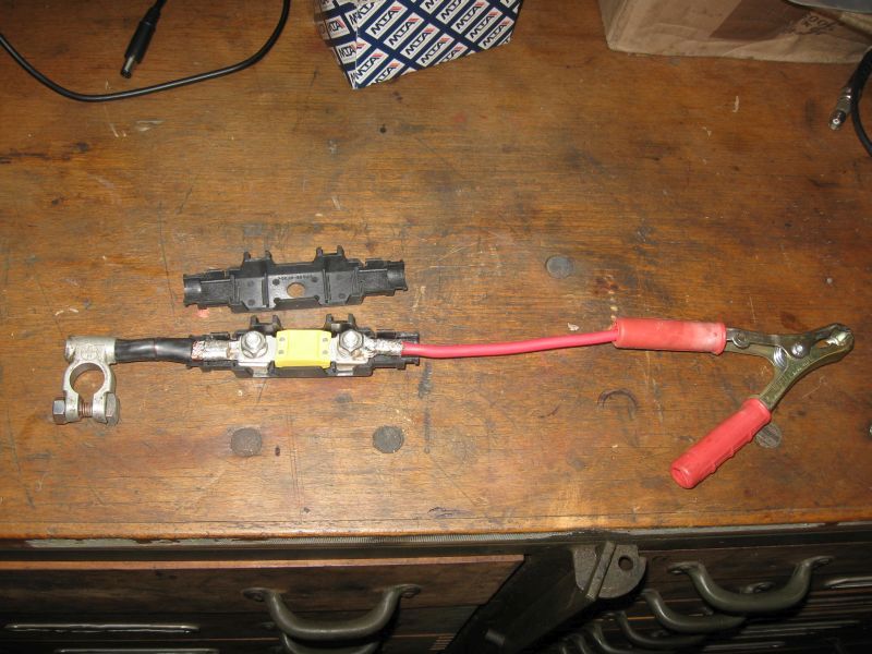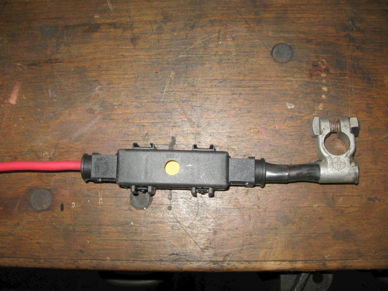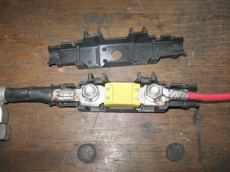 Eine gleiche VRLA-Batterie A0045418601 (70Ah) wurde mittels Anschlußkabel und 100 A-Sicherung parallel zur Verbraucherbatterie angeschlossen. Für die 100A-Maxi-Sicherung mit M8-Loch gibt es ein aufklappbares Gehäuse. Anschlussklemen für die Batteriepole und Batteriezangen sind an die Kabel angepresst und verlötet. |