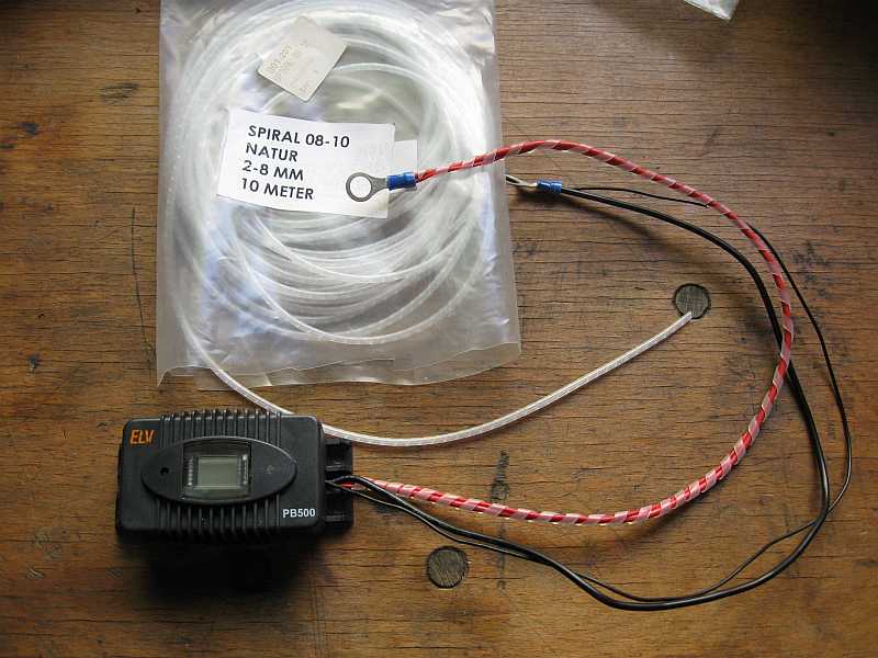 Eine Spiralumhüllung von Fa. Reichelt (Bestell-Nr. B01-201, Spiral 08-10 mm, ) hält die je zwei Kabel zu jedem Batteriepol zusammen. Für den Impulsstrom und für die Spannungsmessung sind getrennte Leiter vorhanden. Man kann auch das Pb500 mit Batterieklemmen versehen und so mobil an verschieden Batterien einsetzen. |