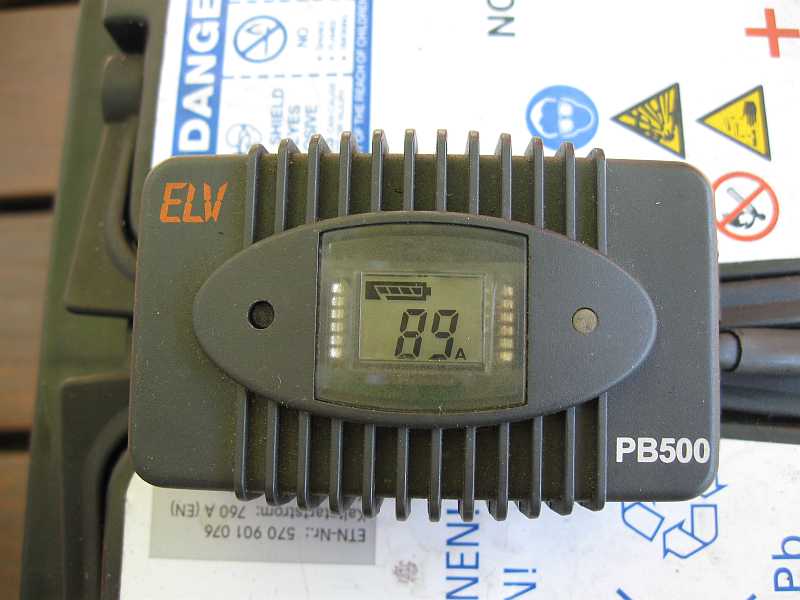 Das kleine Kästchen mit Digitalanzeige misst nicht nur die tatsächliche Kapazität in Prozent der ursprünglichen Batteriekapazität (z.B. 75 Ah), sondern auch die Batteriespannung. Zusätzlich zeigt es auch auch die Stromstärke der Regenerierimpulse an. Diese belasten die Batterie kurzzeitig mit etwa 80 A. So wird eine Sulfatierung der Batterie vermieden. |