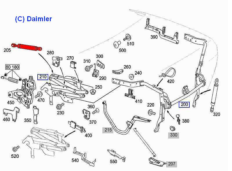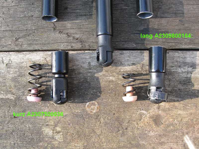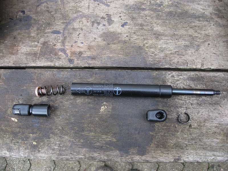 Gasdruckfeder Heckdeckel aus-, einbauen: AR88.50-P-5110R Zur Abstützung des geöffneten Heckdeckels wird von Mercedes eine teure universelle Abstützung W170589046300 mit Verlängerung (Adapter) W230589086300 Euro verwendet. Der Heckdeckel kann von einem Helfer oben gehalten werden. Ausbau: Sicherung oben bzw. unten mit einem Schraubendreher nur anheben und Gasdruckfeder abnehmen. Am neuen Gasdruckdämpfer die gebogene Sicherung oben und unten nicht ausclipsen (abhebeln), da sonst die Vorspannung verloren geht. Einbau: nur aufdrücken. Eventuell etwas fetten. |