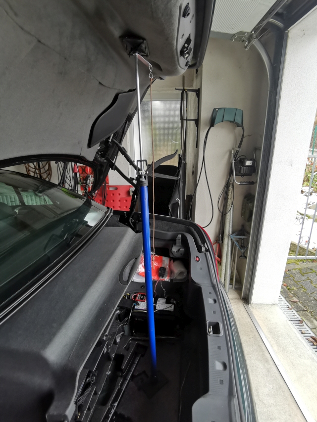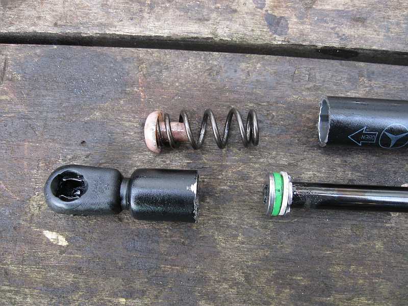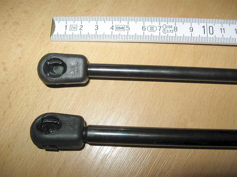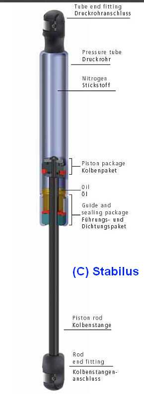 Der Zylinder enthält eine kleine Feder (Pop Up Feder), doch die wird nur zusammengedrückt, wenn die Kolbenstange fast ganz eingeschoben ist (Deckel geschlossen). Damit wird beim Öffnen des Heckdeckelschlosses der Heckdeckel durch die Federkraft etwas angehoben. Erst beim Hochheben des Heckdeckels wirkt der Gasdruck als Unterstützung. |