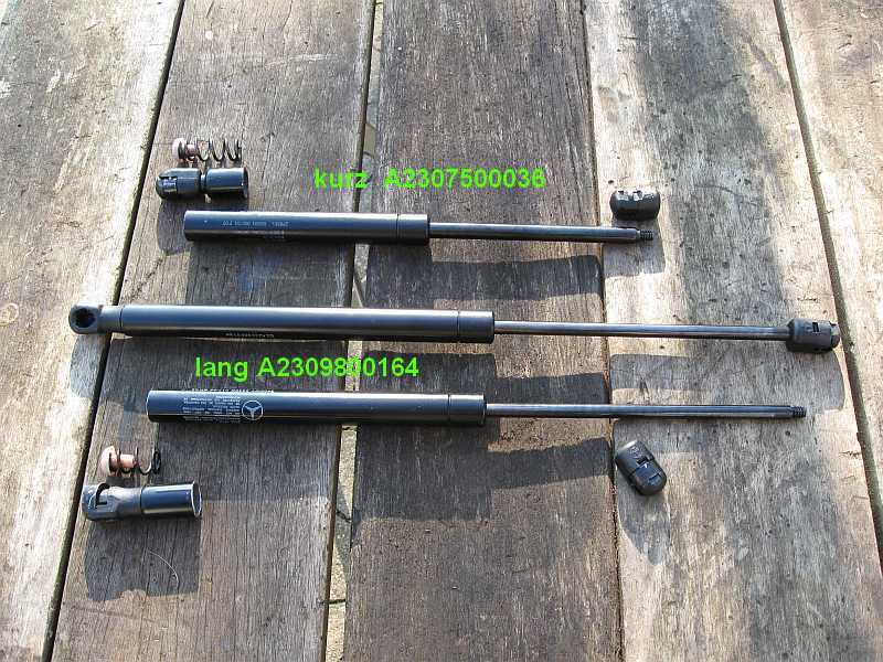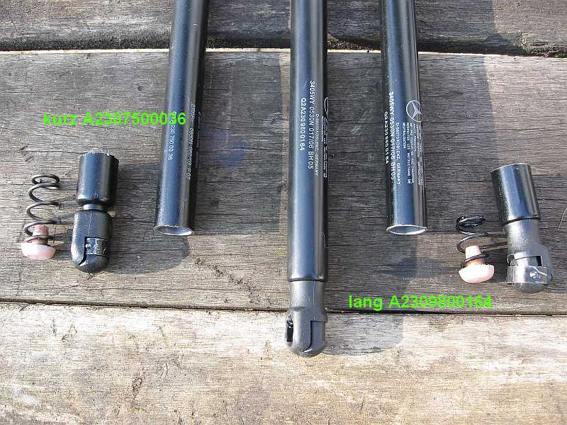 A2309800164: Gasfeder für Heckdeckelfunktion ab Fahrgestell Nr.113588 ab Bj. 06.09.2005, sie besitzt den Code NQ7, Werk Bremen Stabilus Mercedes LIFT-O-MAT, 002431, 530 N, Länge 415 +-2 mm (jeweils Bolzenmitte), Gesamtlänge 437 mm, Hub 160 mm, Durchmesser Kolbenstange 8 mm, Zylinder 19 mm, dynamische Dämpfung in Ausschubrichtung, Ausschubkraft F1 = 530 +- 15 N, Einschubkraft F4 = 910 N Dieter (GWRA) und XL-Andi (sl-r230-forum.de) wiesen im Forum (26. Juni 2014) auf die Fa. Botem hin, die die Heckklappen-Gasdruckdämpfer in besserer Qualität liefert (www.botem.de), Tel.: 02103 249644, info@botem.de . Forumsmitglieder bekommen sie etwas günstiger. Zwei Gasdruckdämpfer Artikel-Nr. 27830 Febi, A2309800164 kosteten bei Fa. botem 54,90 Euro inkl. MwSt./ Versand (kein Internet-shop) . |