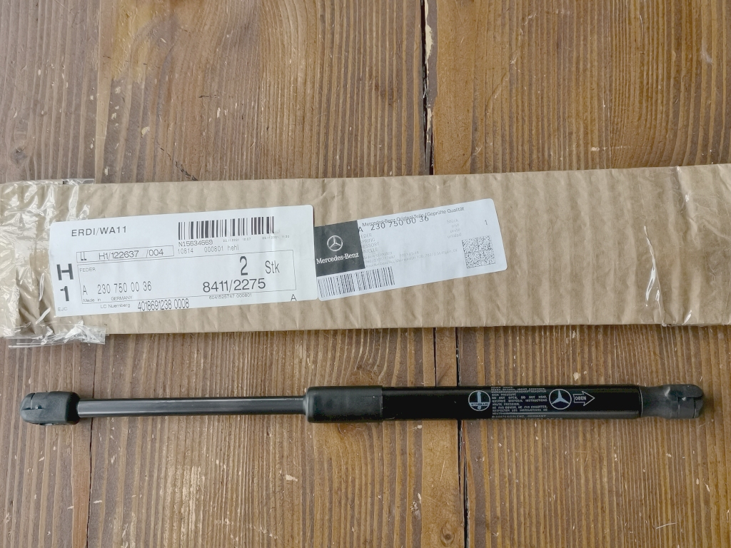 A2307500036: Feder für Heckdeckelfunktion: Alle R230 bis Fahrgestell Nr.113587, bis Bj. 06.09.2005, z.B. SL55AMG Altteil: Mercedes/Stabilus LIFT-O-MAT, 2705RE, 650 Nm, Gesamtlänge 355 mm, Durchmesser: Kolbenstange 10 mm, Zylinder 19 mm. Aufdruck Markenzeichen Mercedes und Stabilus, |