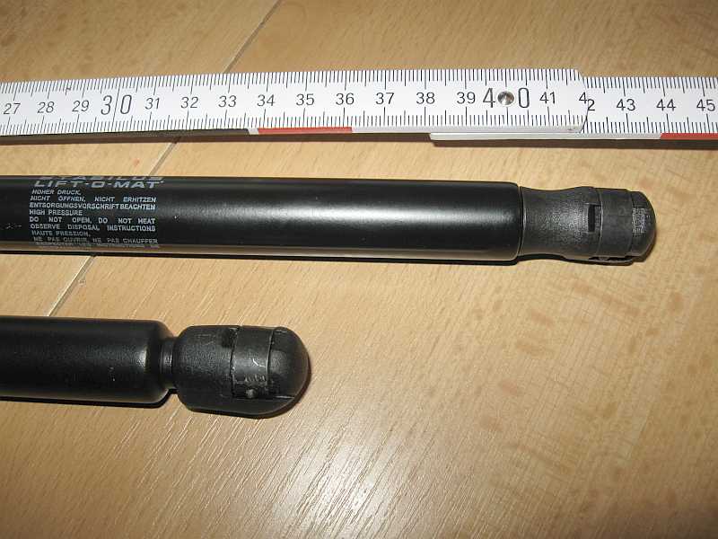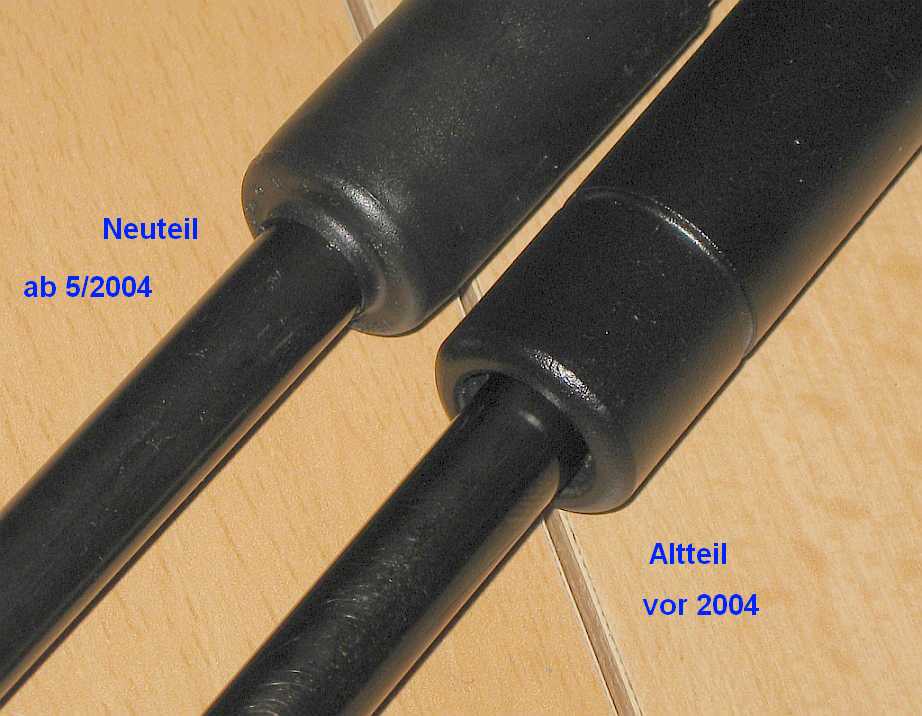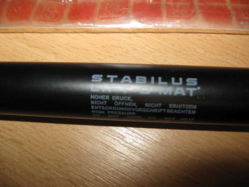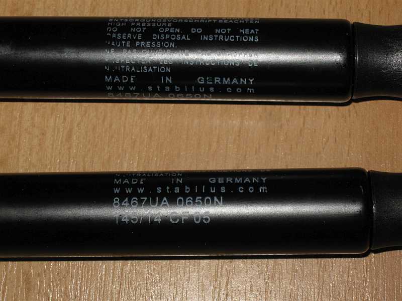 Neuteil Zubehörhandel: Stabilus LIFT-O-MAT, 8467UA, 0650 N, 145/14 CF05, Zylinder 18 mm, Länge Kugelzapfenmitte 333+-2 mm, Hub min. 117 mm, Ausschubkraft 650 +-15 N, Einschubkraft max. 1470 N gekauft am 20.01.15 bei Autoteile Baumgarten, 86857 Hurlach, ebay-shop, Unterschied Altteil - Neuteil: Seit 2004 wird der Zylinder mit einer Schutzkappe und einem Filzring im geölten Bördelinnenbereich von Stabilus geliefert. siehe auch Zerlegung des Gasdruckfederdämpfers. |