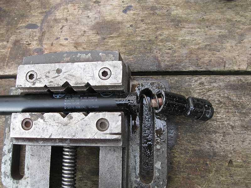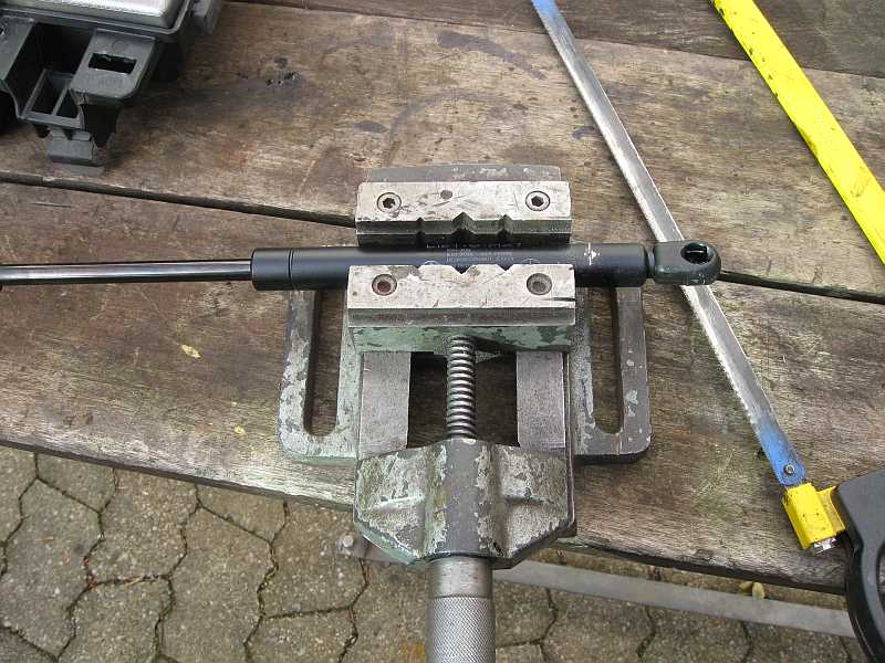 Auf dem LIFT-O-MAT-Zylinder steht: "Entsorgungsvorschrift beachten" und "High Pressure". Auf der Webseite www.stabilus.de/service-ersatzteile/recycling/ findet man die Anleitung dazu. Wird die Gasdruckfeder mit der Kolbenstange waagrecht in einen Schraubstock eingespannt, befindet sich die geringe Menge Kolbenöl (ca. 3 ml) unten. Nun kann man den Zylinder oben (etwa 2 cm Abstand) ansägen oder mit einem 1 mm Bohrer anbohren. Beim Sägen hört man dann ein leichtes Zischen und das war es, also ungefährlich. Im Kolben sind zur Schmierung der Dichtung am Zylinder und zur Dämpfung etwa 3 ml Öl enthalten. Wenn drucklos, kann der Zylinder an der Sicke zusätzlich aufgesägt werden. Der Kunststoffhalter für den Kugelzapfen ist an der Kolbenstange nur aufgeschraubt. |