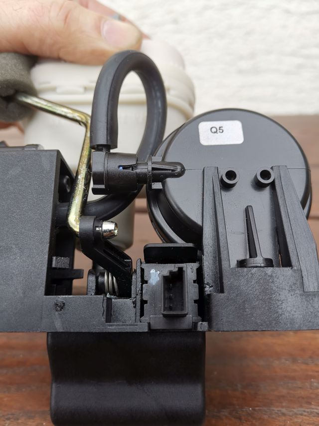 Das 1. Bild zeigt die weiße Druck-/Unterdruckdose des Heckdeckelschlosses 10 nach abgebauter Verkleidung innen am Heckdeckel.