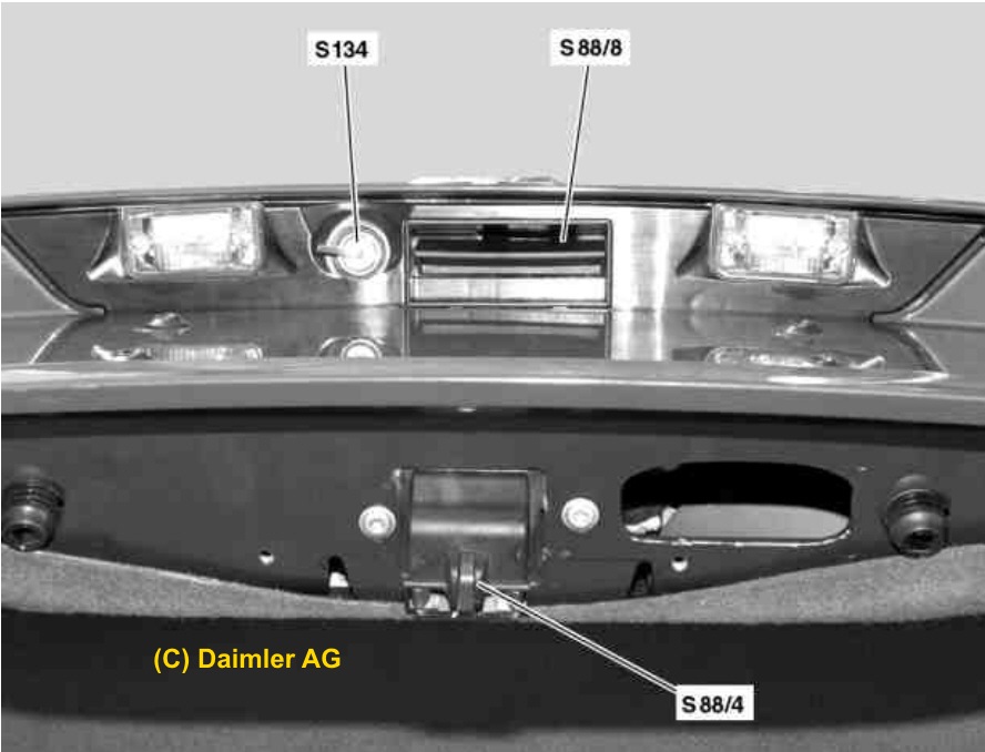 S134: Schalter Heckdeckelverriegelung, S88/8: Schalter Heckdeckel (Griff), (nur USA: S88/10: Schalter Heckdeckel Notöffnung), Außenbetätigung