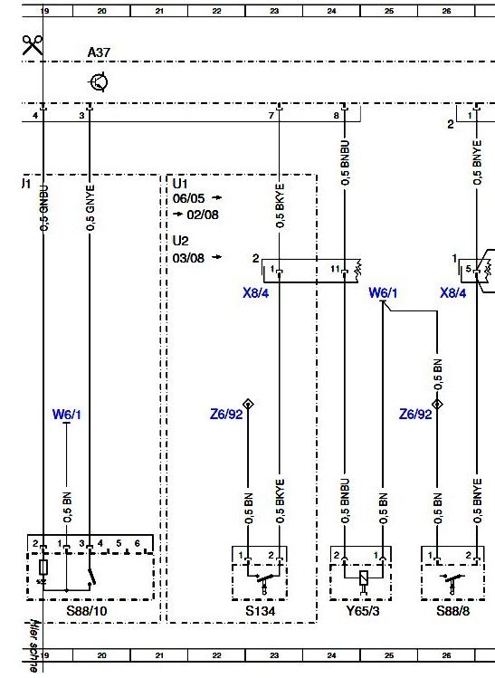 Drehfalle-Schaltern S88/4s1 und S88/4s2 auf Masse (Massestelle W6/1) im Kofferraum links) gelegt werden.