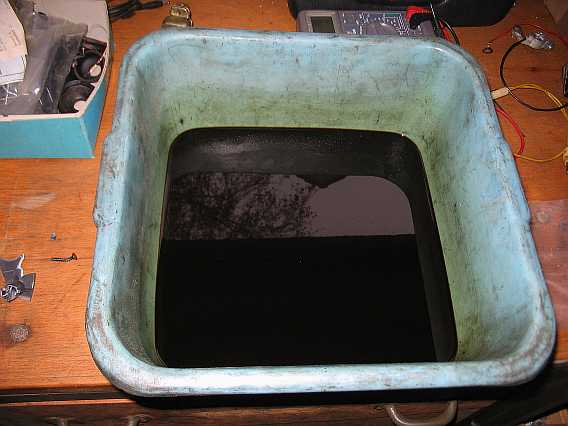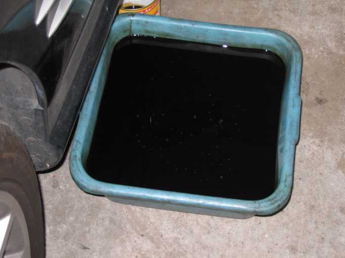 Die 10 l-Wanne ist für die 8,5 Liter fast zu klein und schlecht zu bewegen. Einfacher ist es, zuerst abzusaugen (siehe auch Tipp Ölabsauganlage) (etwa 6,5 Liter) und dann die Ablassschrauben öffnen. Dabei fließen aus der hinteren Ölwanne insgesamt noch etwa 2 Liter Öl aus. Die kann man in einer kleinen Schüssel auffangen. Leider liefert Westfalia zu kurze Absaugschläuche. Aus einem der mitgelieferten Messingrohradapter machte ich mit einem Polyamid-Benzinschlauch einen längeren Absaugadapter. |