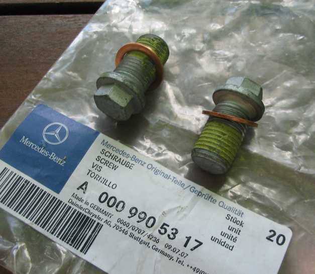 Ölablassschrauben und Dichtringe erneuern, siehe Maßnahme Ölablassschraube ( BT01.45-P-7500-01R beachten: Das Gewinde der neuen Schraube ist mikroverkapselt. Ölablassschraube A0009905317: M14, 13mm Schlüsselweite, Anzugsdrehmoment 30 Nm. Dichtring Kupfer N007603014106, 20 x 14,5 x 2,7 mm. |