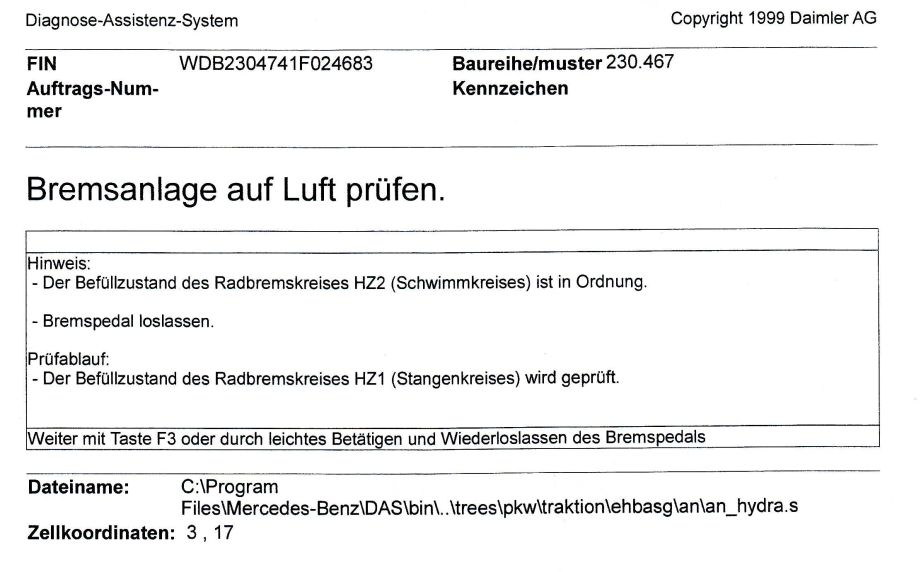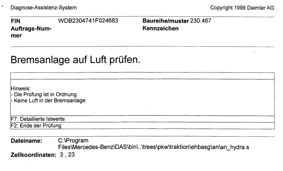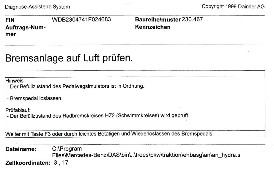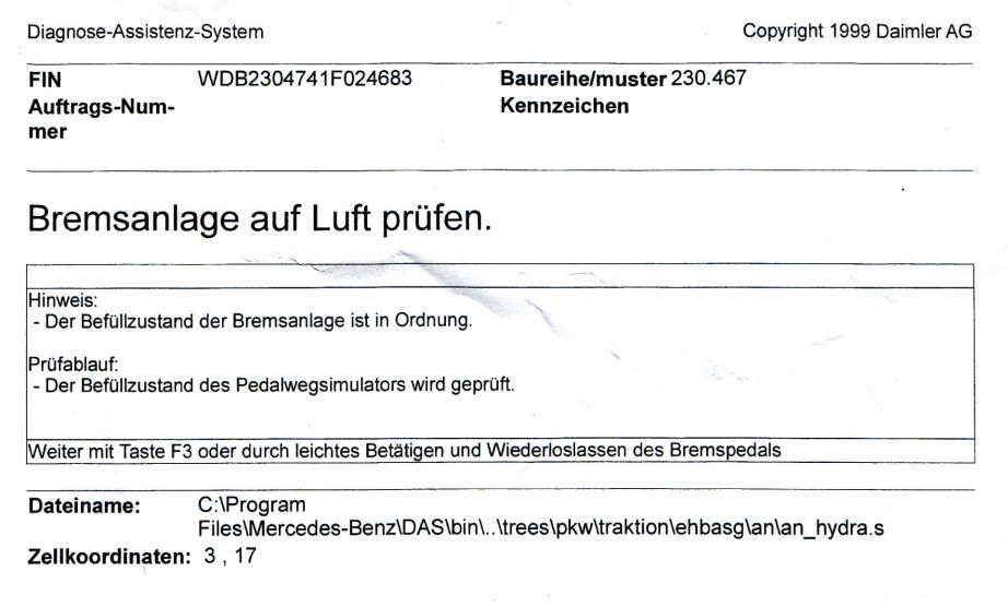 Beim Bremsflüssigkeitswechsel am 1.April 2014 bei Mercedes führte die Diagnose eine Reihe von Prüfroutinen durch (siehe die Diagnose-Ausdrucke). Dabei wird auch der Pedaldrucksimulator auf Luft geprüft. |